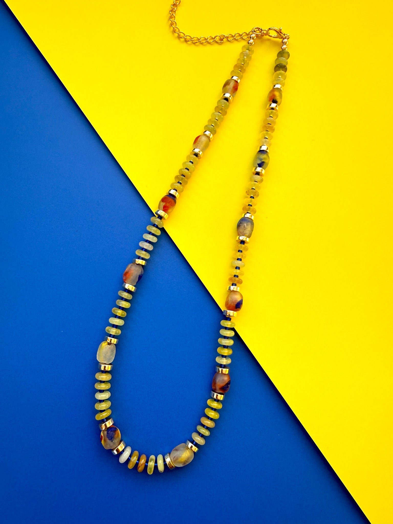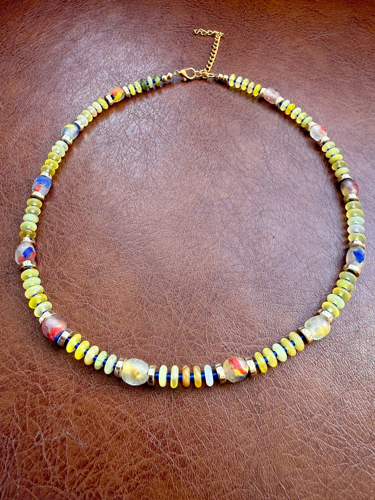 This 17 inch necklace features luminous yellow agate rondelle beads as the foundation of the design. Between each agate bead sits a recycled African glass bead with painterly splashes of red, blue, and yellow, giving the necklace a lively, expressive rhythm of color.