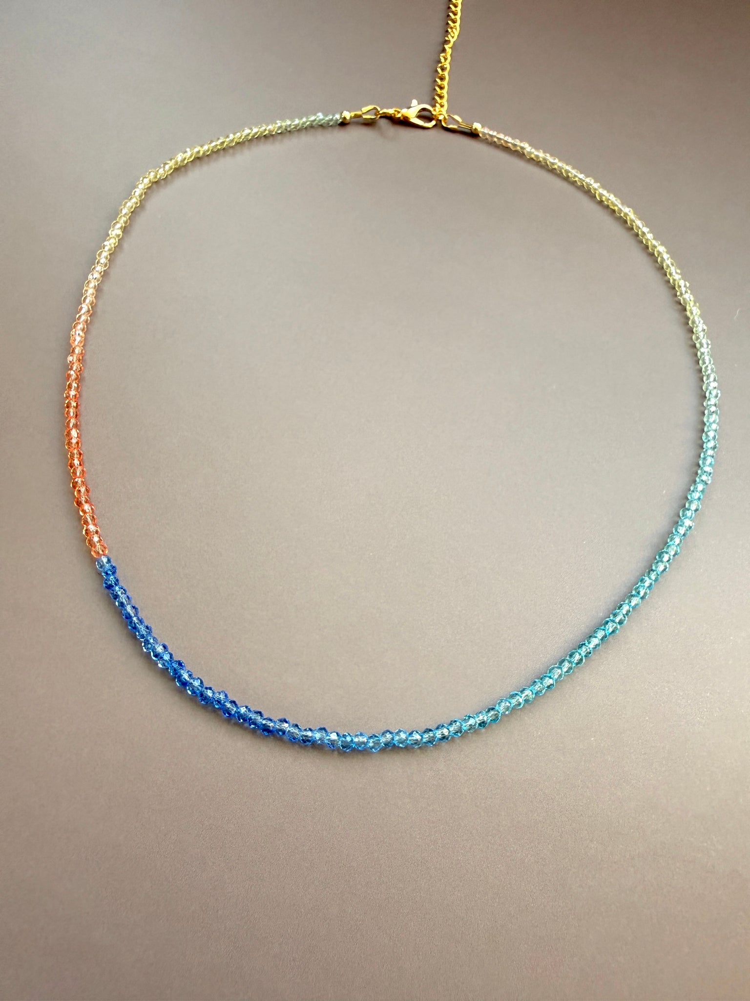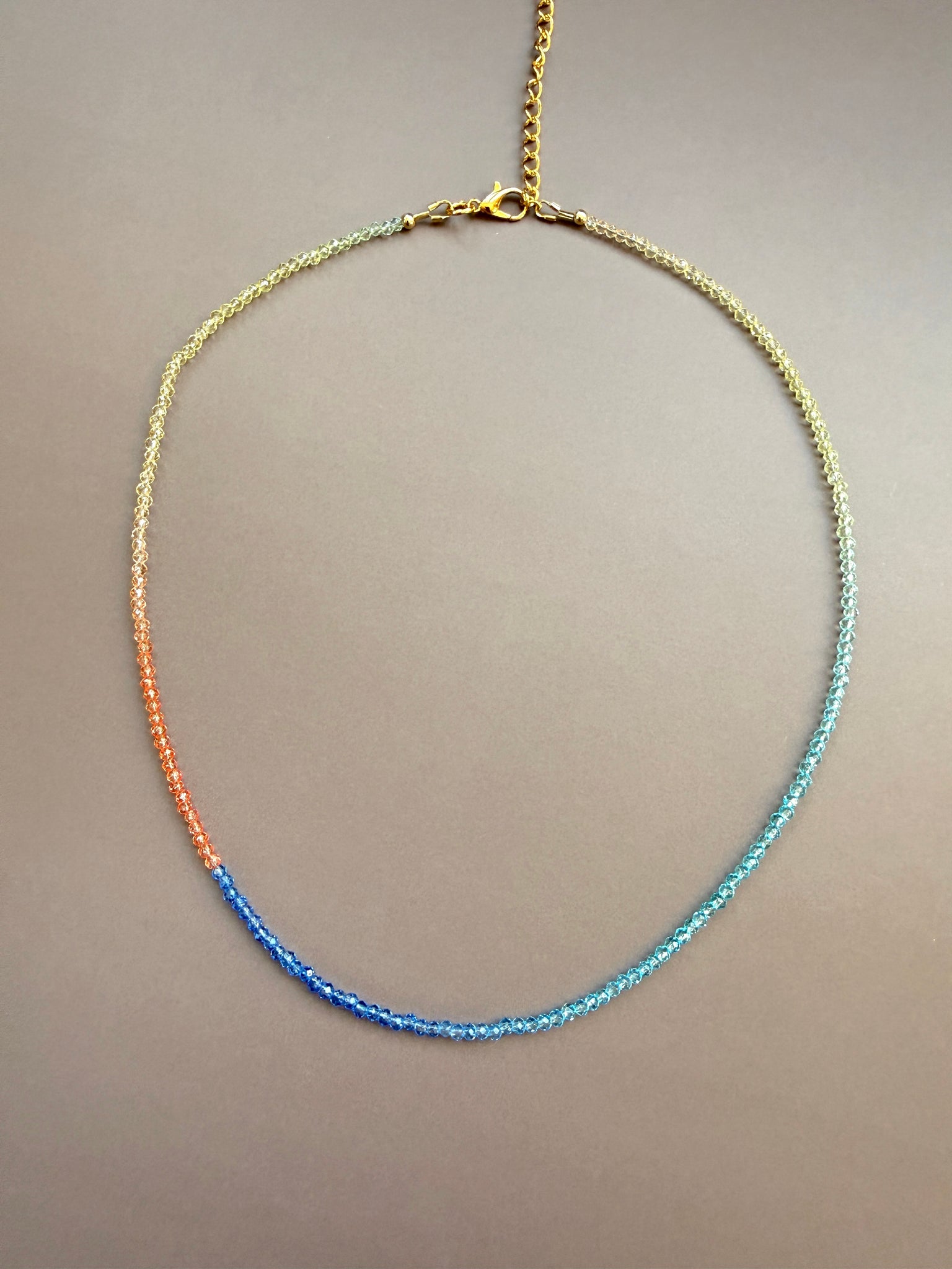 This necklace features a 16 inch strand of tiny 2.5mm faceted glass beads arranged in a beautiful ombre gradient that shifts from orange to blue to green. The faceted beads catch the light beautifully, creating a subtle shimmer that adds just the right amount of sparkle.