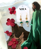 This listing is for emerald green, crystal, rhinestone earrings featuring a brass star connector.