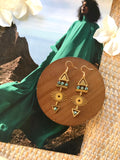These unique, wire wrapped, bohemian dangle earrings were made using raw brass geometric shapes, gold plated sunburst connectors, and African Turquoise beads. They measure approximately 3.0" inches in drop length, and about 1.0" inches across their widest point.