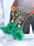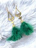 These are long, unique, emerald green feather earrings featuring art deco inspired brass connectors.