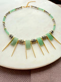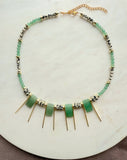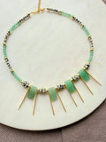 The necklace is adorned with green aventurine pendant beads, adding depth and dimension, while the gold spikes introduce a rebellious twist to the bohemian design. Perfect for layering or wearing solo, this piece effortlessly elevates both casual and dressed-up looks.