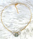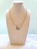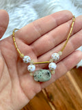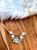 This unique, fully beaded, gemstone necklace features one large 16mm gray spotted jasper gemstone, etched white & gold star beads, golden rutile quartz beads, and gold glass barrel beads. It features a lobster claw closure and a 2.5" extender. This necklace is approximately 16" long.