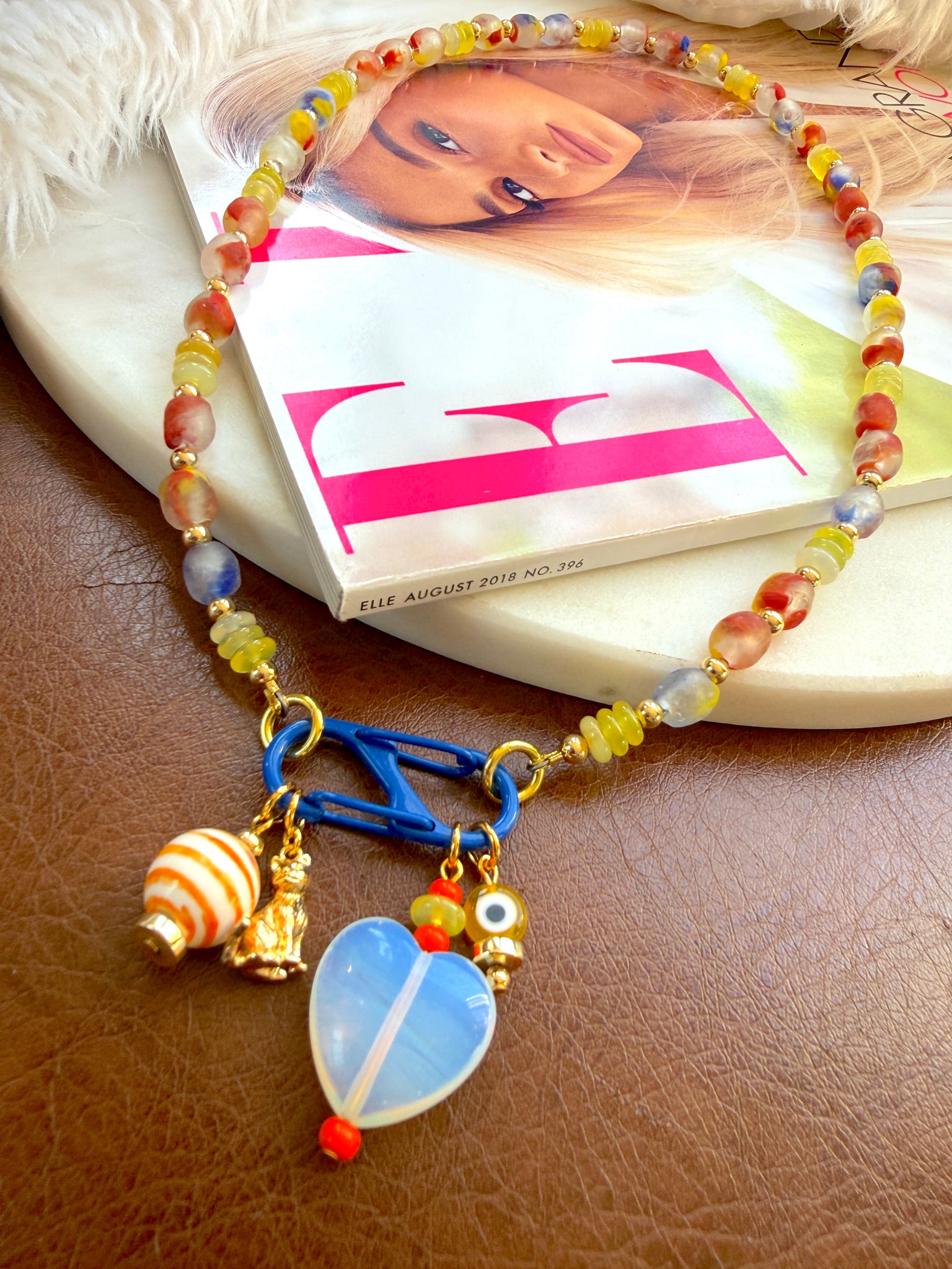 This 19 inch statement necklace features limited edition African recycled glass beads that are clear with expressive splotches of red, blue, and yellow, giving each bead a painterly, abstract look. These vibrant beads alternate with yellow agate rondelle beads, creating a rhythmic pattern of color and texture throughout the strand.
