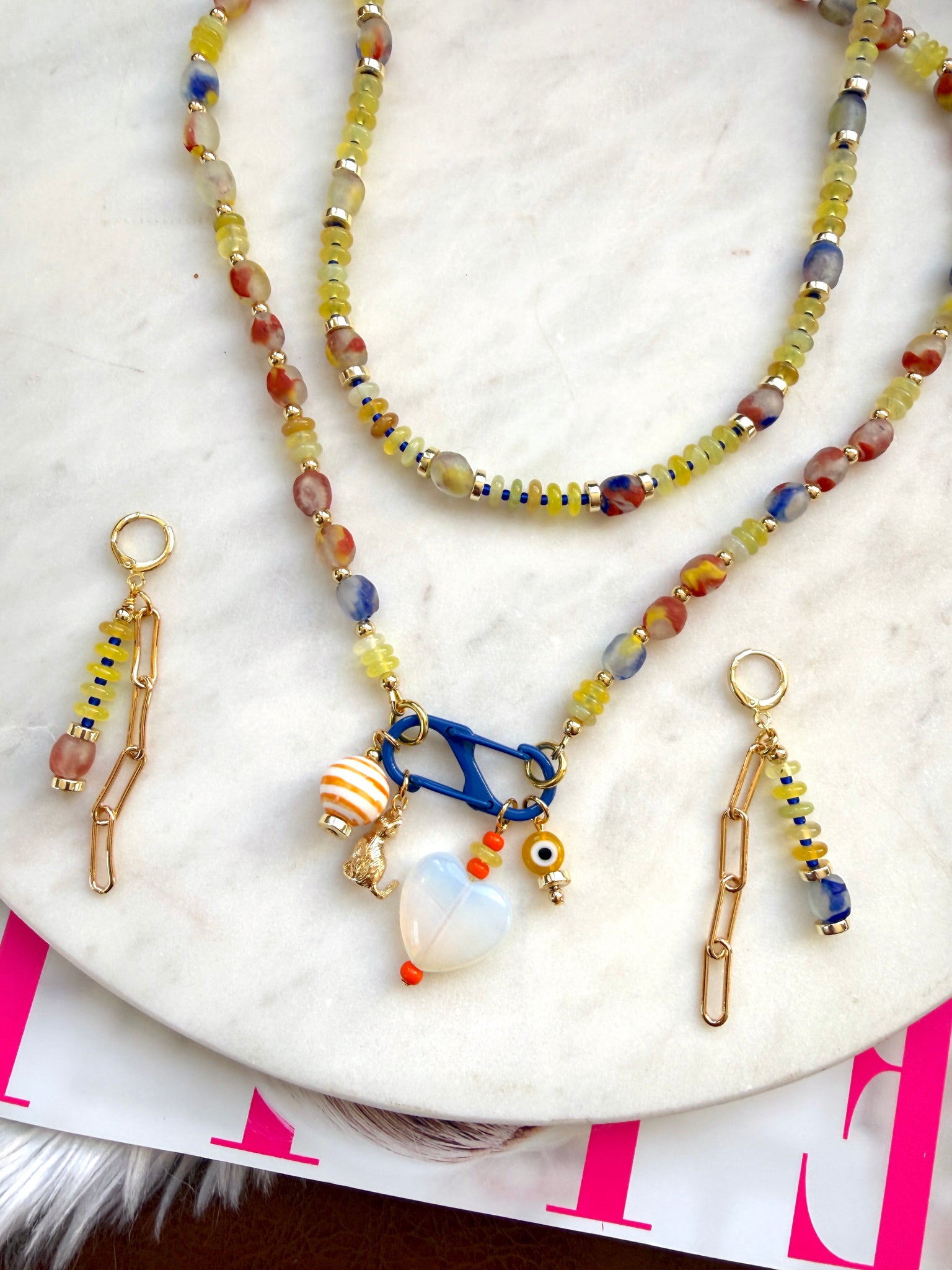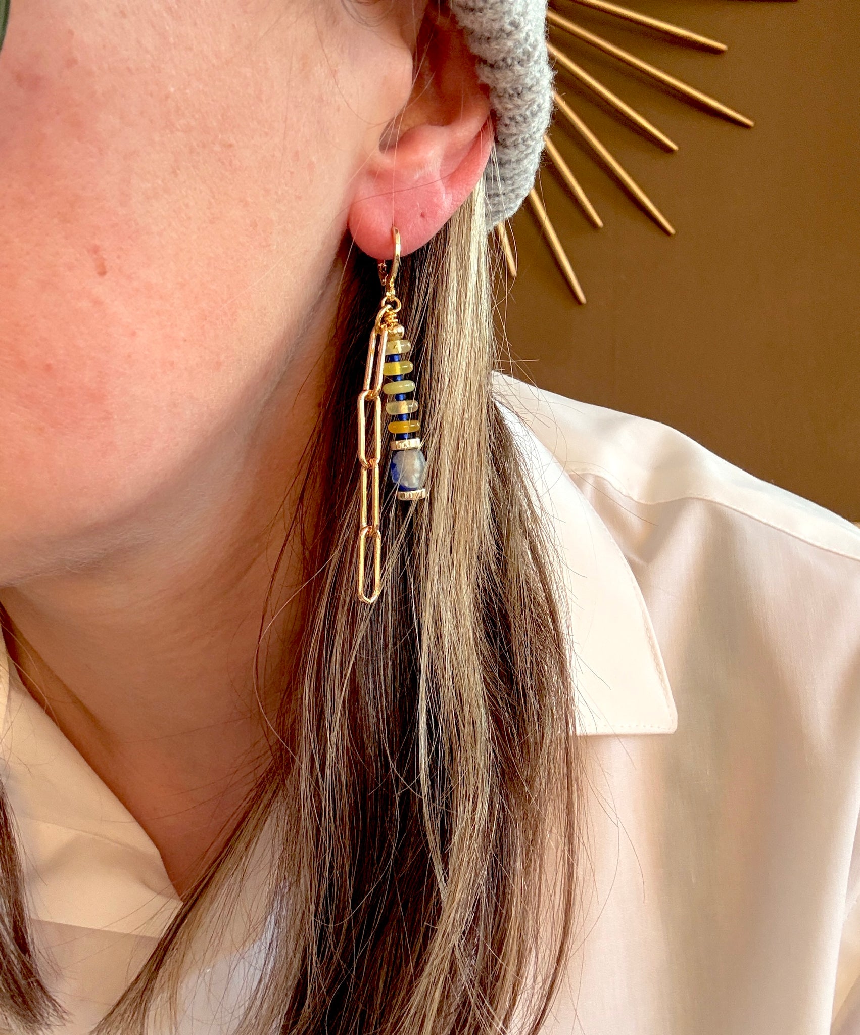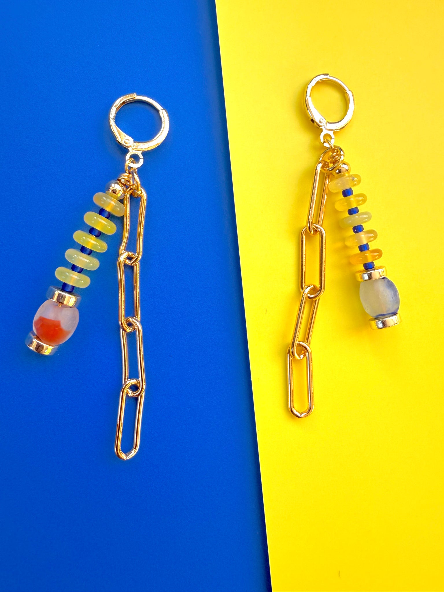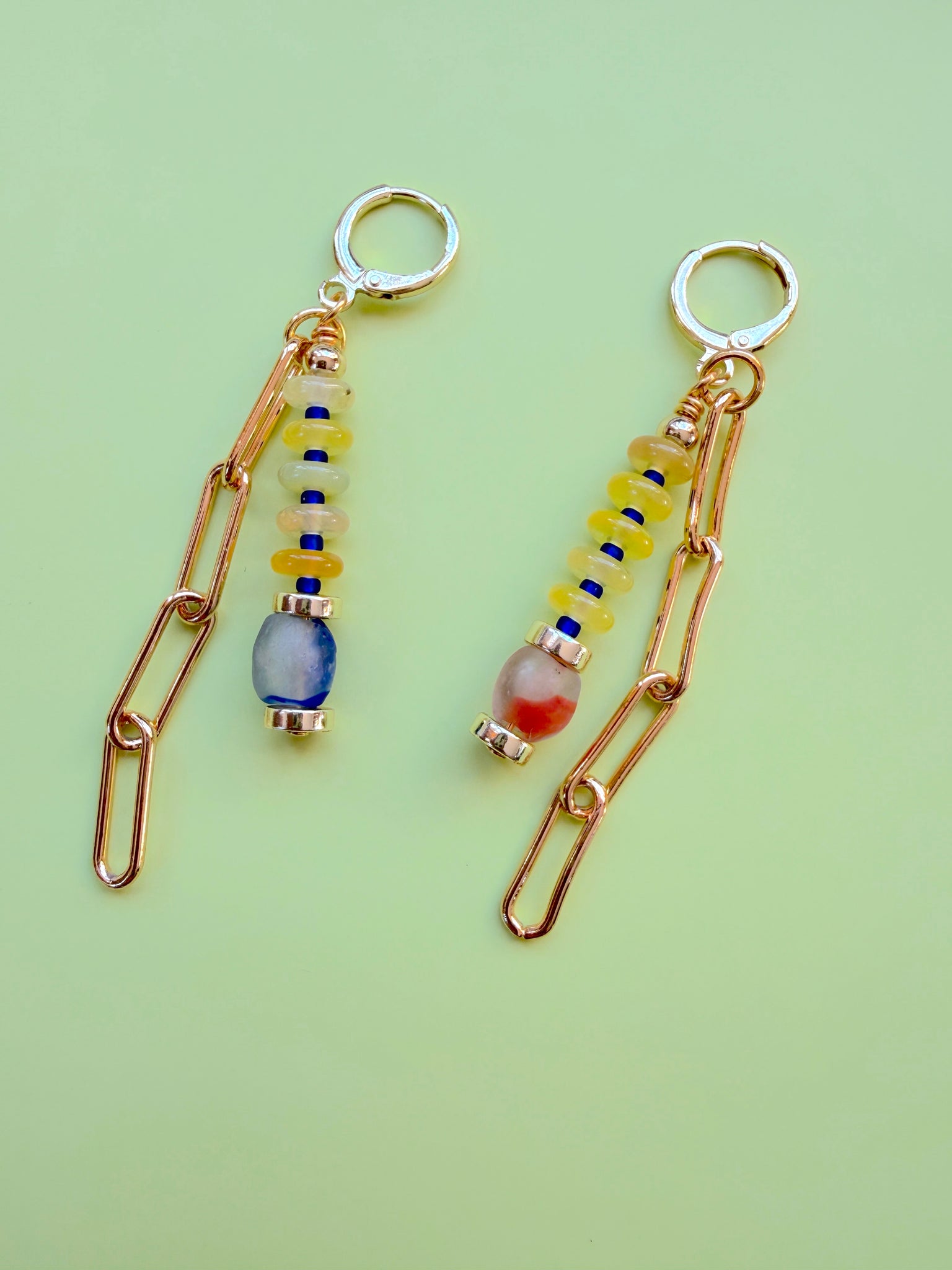These 2.5 inch dangle earrings feature vibrant yellow agate beads accented with tiny cobalt blue seed beads for contrast and dimension. At the base of each earring hangs a recycled glass bead with painterly splashes of color, making every pair slightly different.