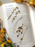 These delicate earrings hang approximately 4.25" inches from the lobe. The hooks are 18k gold plated and should be suitable if you have a metal allergy or sensitivity. Due to the nature of the materials, these earrings are very lightweight and easy to wear.