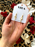These are delicate, minimalist earrings featuring a long brass chain and your choice of connector. The imitation shell connector is pictured, but you can also select any birthstone color and I will make to order.