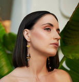 These are dramatic, shoulder-dusting, beaded, mobile earrings featuring raw brass geometric shapes, dzi agate, and amber lucite. This style hangs approximately 4.40" inches from the lobe and measure about 0.5" inches across their widest point. They feature an 18k gold plated fishhook closure. These earrings are very lightweight and should be suitable for everyday wear.