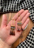 These are dramatic, shoulder-dusting, brass framed, beaded chandelier earrings. This style hangs approximately 3.50" inches from the lobe and measure about 0.8" inches across their widest point. They feature a 18k gold plated fishhook closure. These earrings are lightweight for their size and should be suitable for everyday wear.