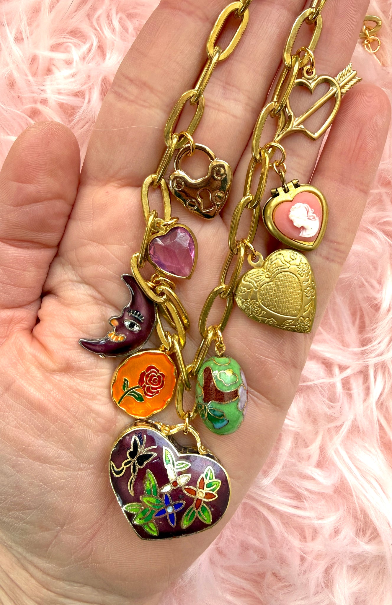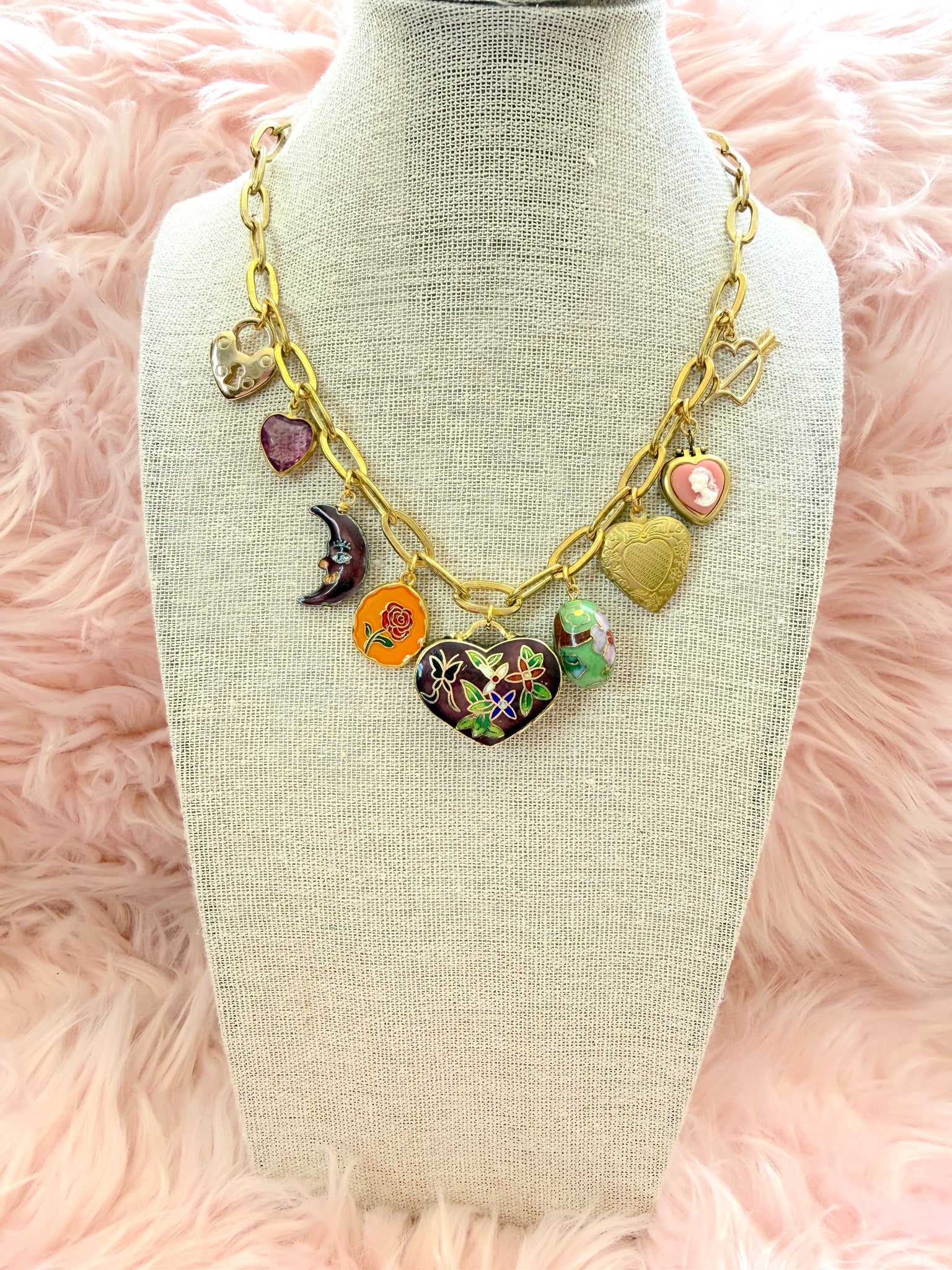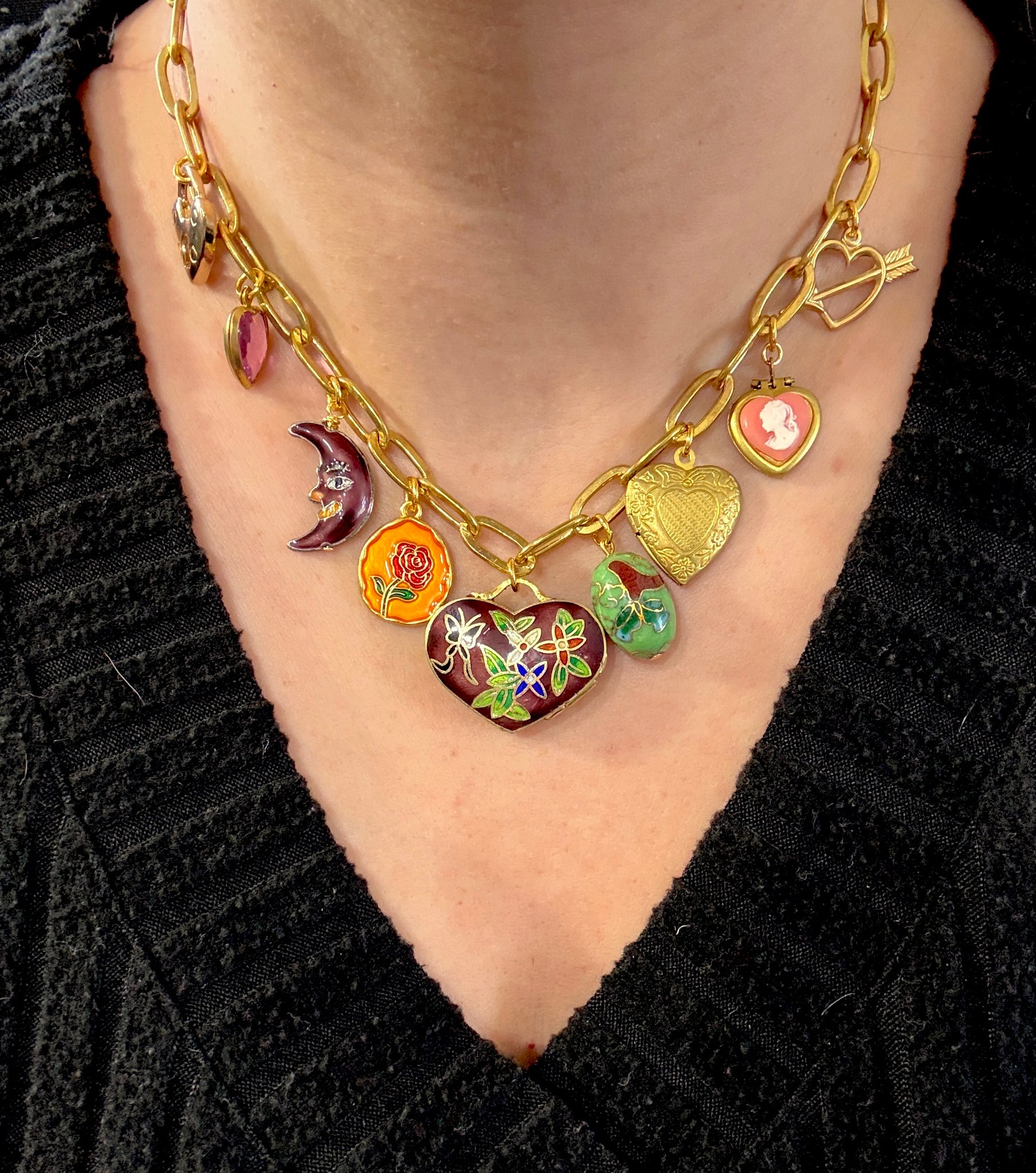 This chunky brass chain necklace features an eclectic mix of vintage heart and floral charms, anchored by a large cloisonné enamel heart poison box charm as the focal point. Statement-making yet timeless, it’s the kind of piece that feels collected over time.