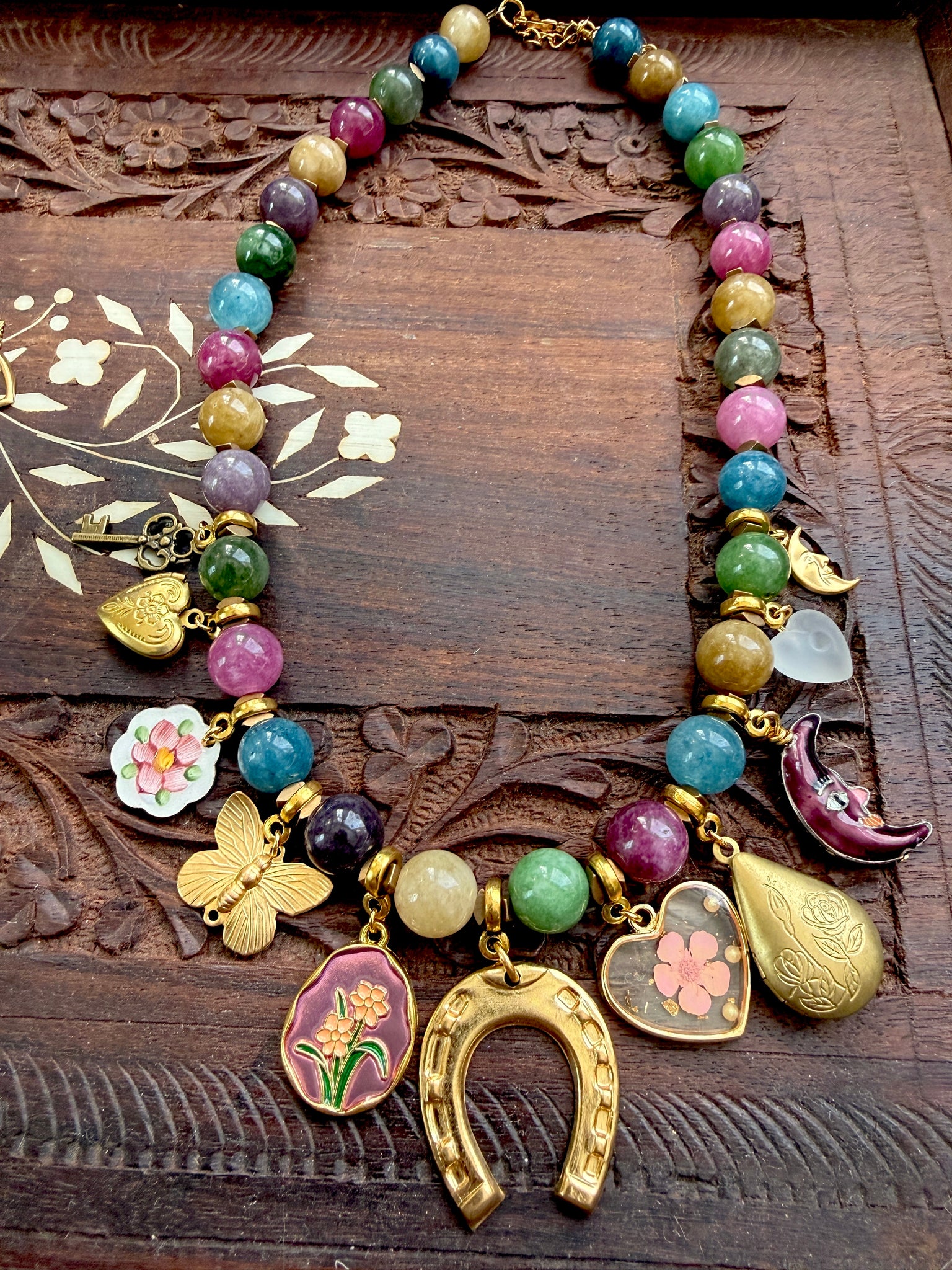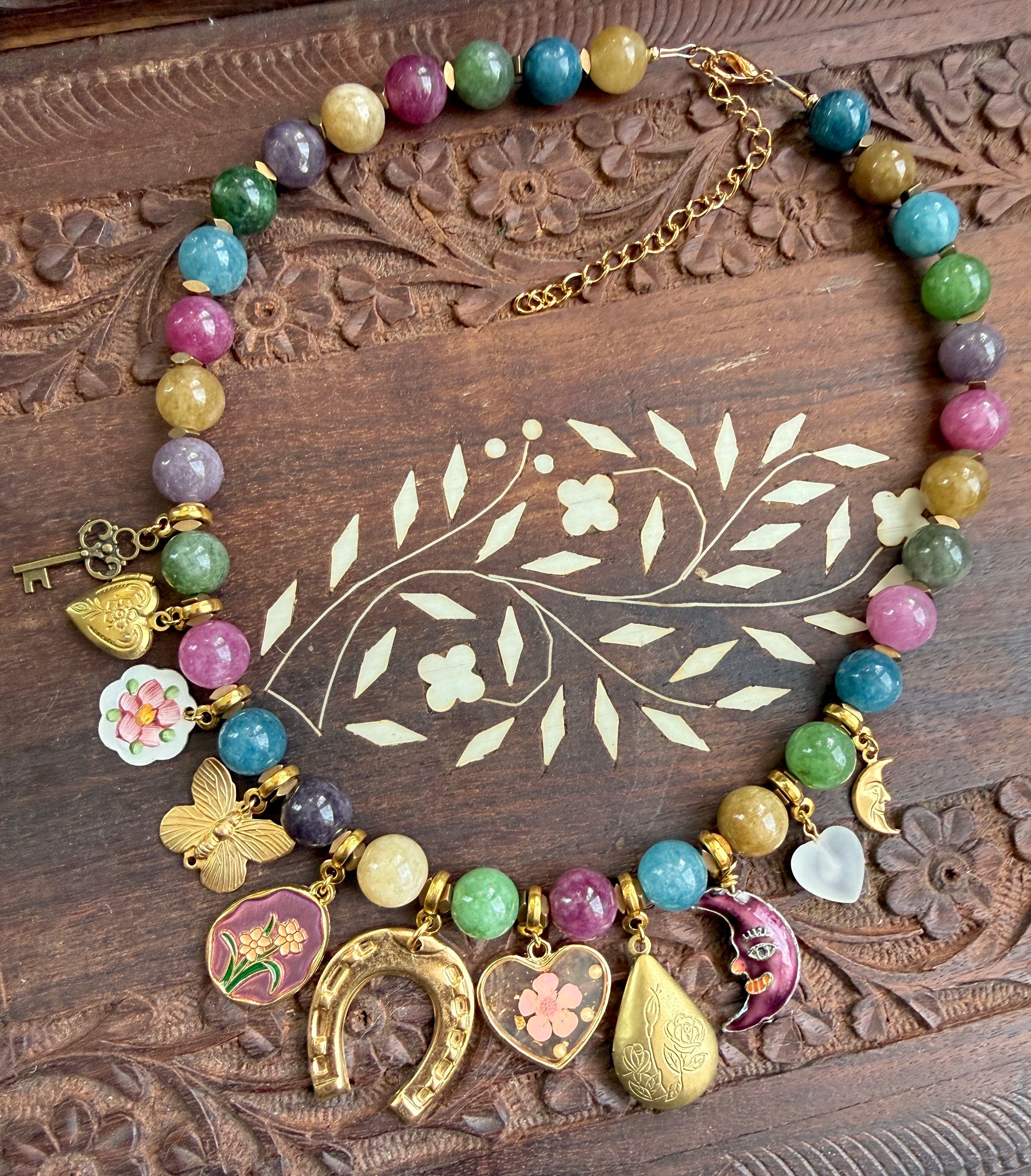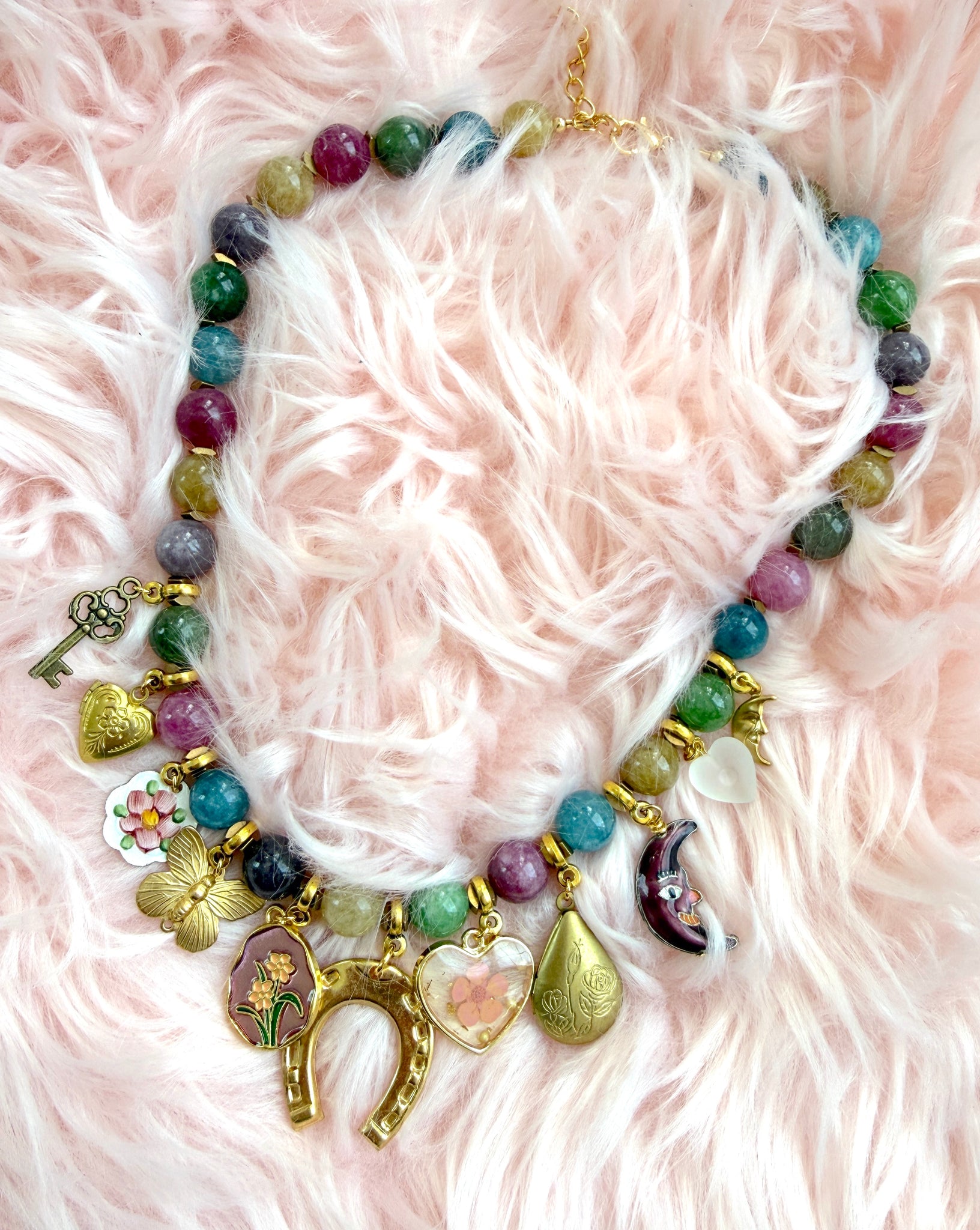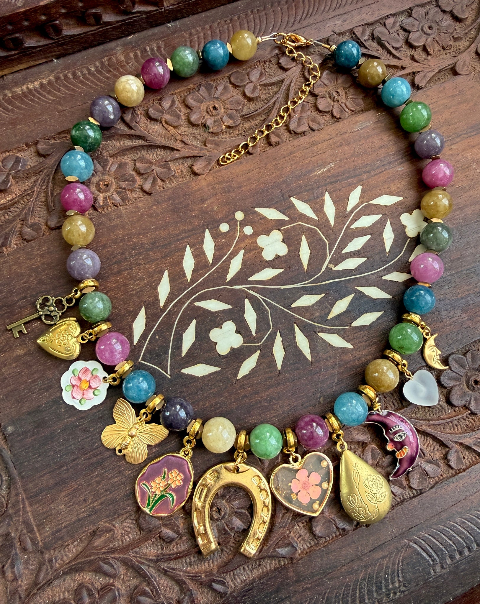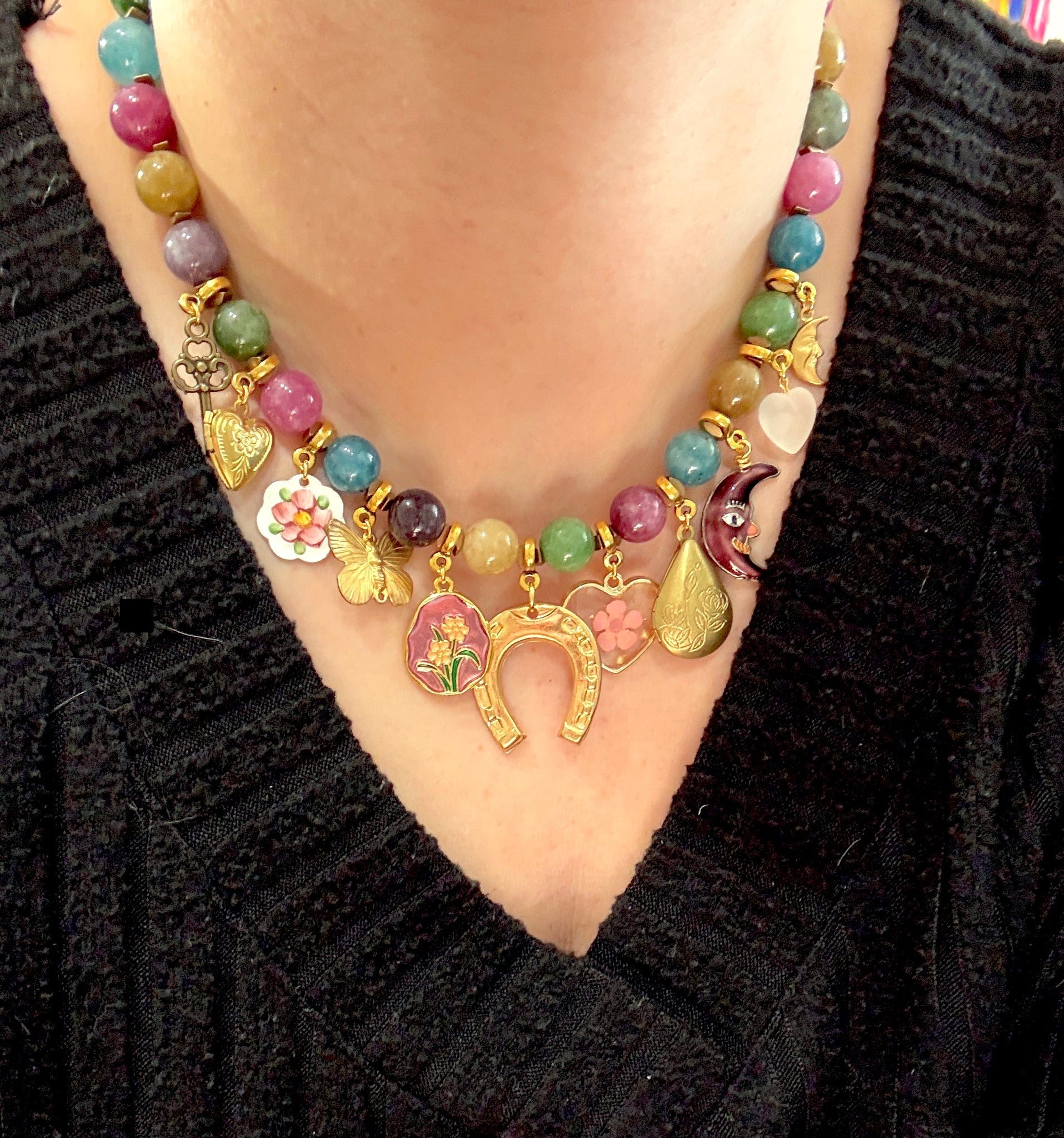 This necklace features rich jewel-tone 10mm dyed jade beads, accented with an eclectic mix of vintage and new charms. A large horseshoe charm sits front and center as the focal point — a timeless symbol of good fortune.