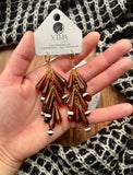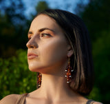 These are dramatic, special occasion, beaded tassel earrings made with amber lucite teardrop beads and dzi agate striped beads. This style hangs approximately 3.50" inches from the lobe and measure about 1.0" inches across their widest point. They feature an 18k gold plated leverback closure. These earrings are medium weight and should be comfortable to wear for several hours.