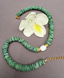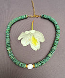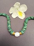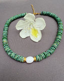 Dark Green Shell Bead Choker with Freshwater Pearl – 14 Inch Necklace with 3 Inch Extender – Minimalist Summer Jewelry