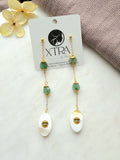 Elevate your style with these striking bohemian statement earrings, designed to captivate and protect. Measuring 4.5 inches long, these sleek earrings feature faceted green aventurine beads, known for attracting luck and prosperity, paired with intricate gold interlocking caps for a touch of luxe shimmer.