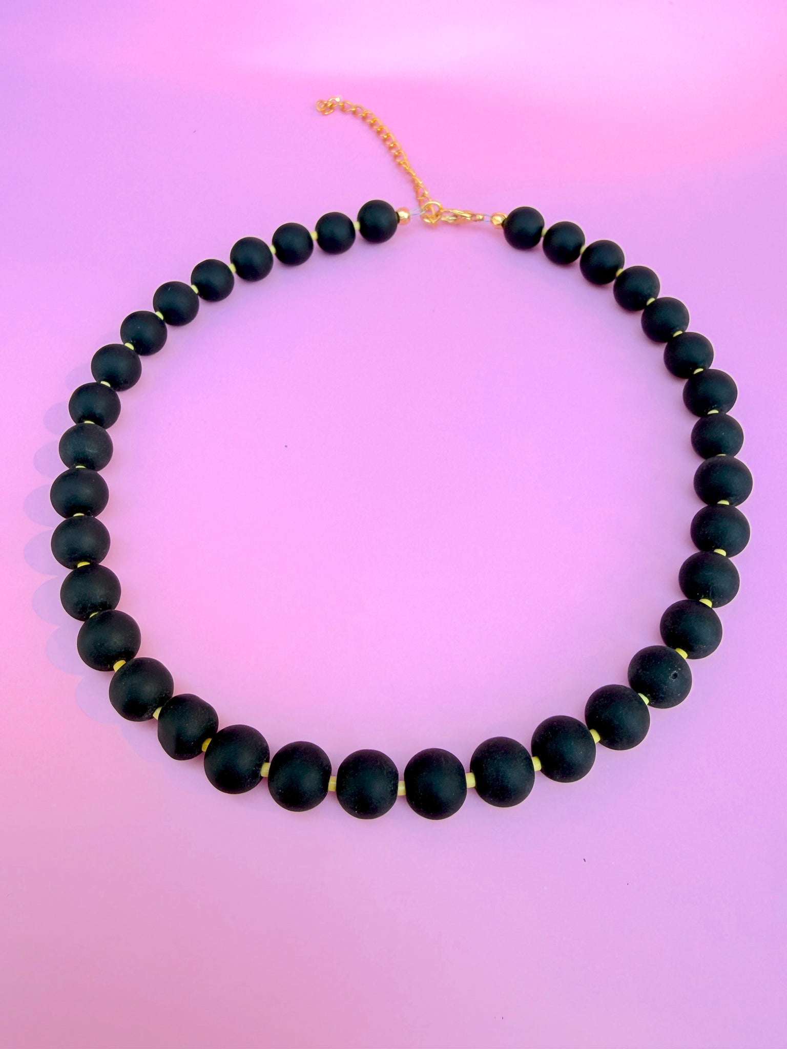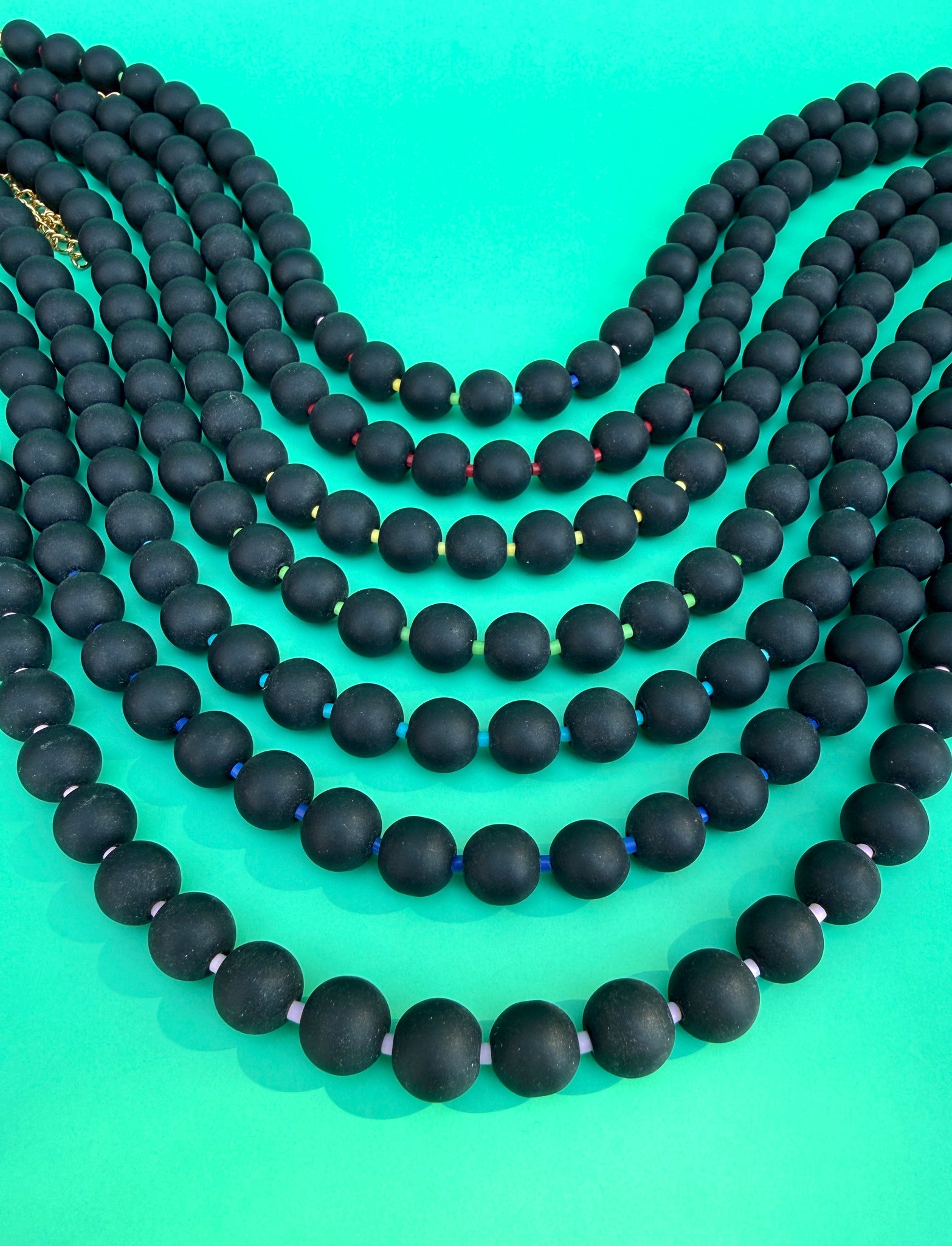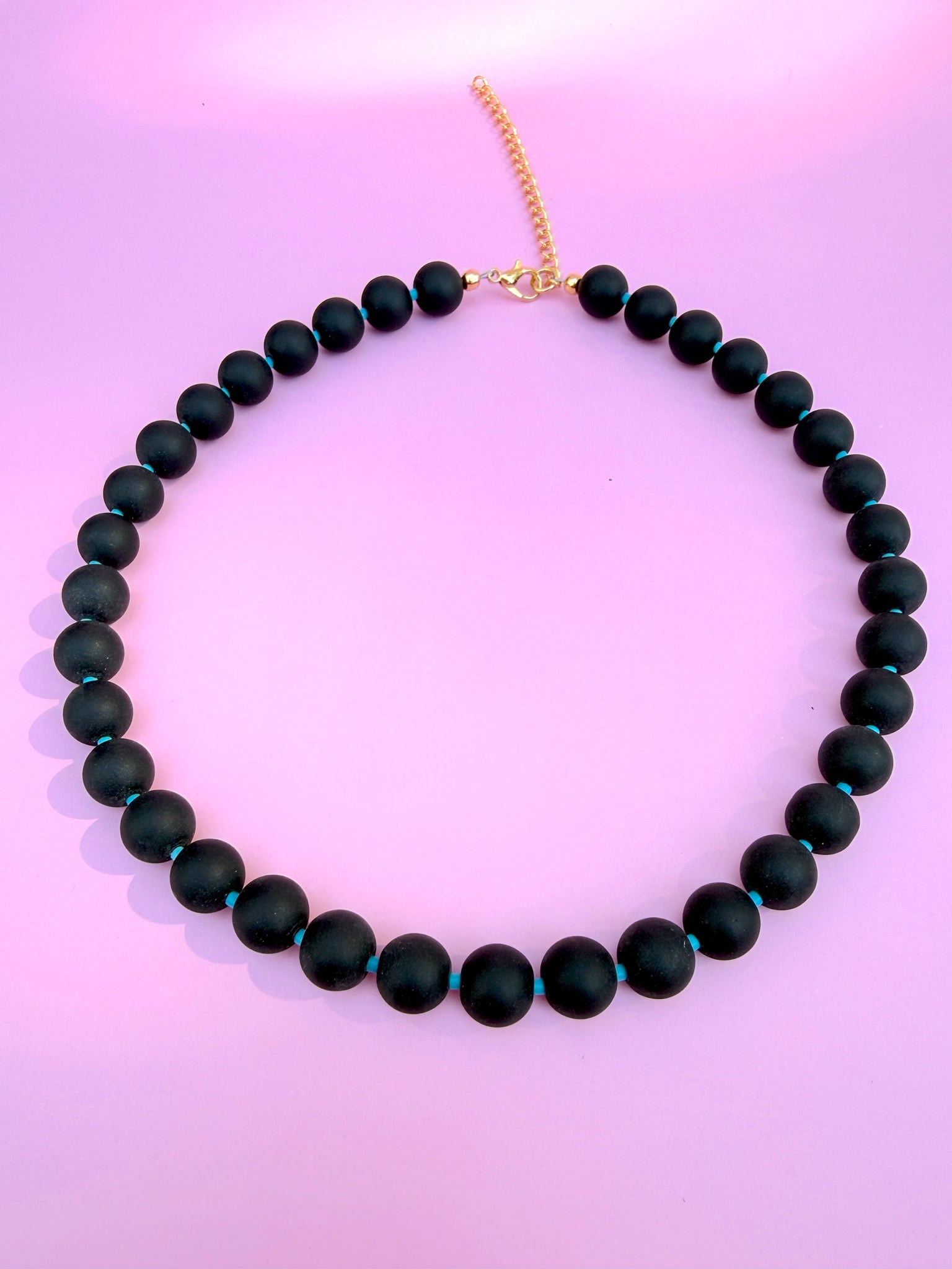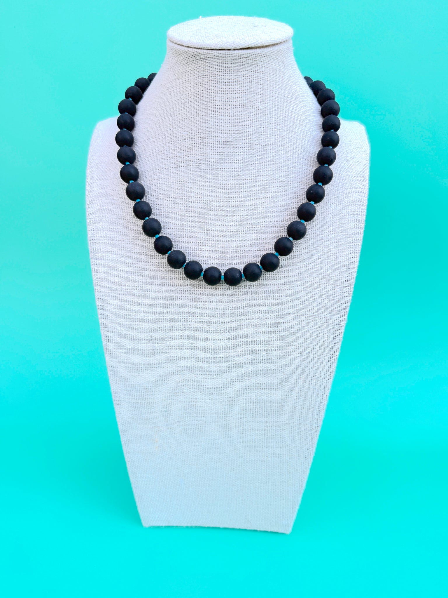 This bold 15 inch chunky beaded necklace features smooth matte black onyx beads accented with your choice of colorful jasper spacer beads for a striking contrast that feels both modern and playful.