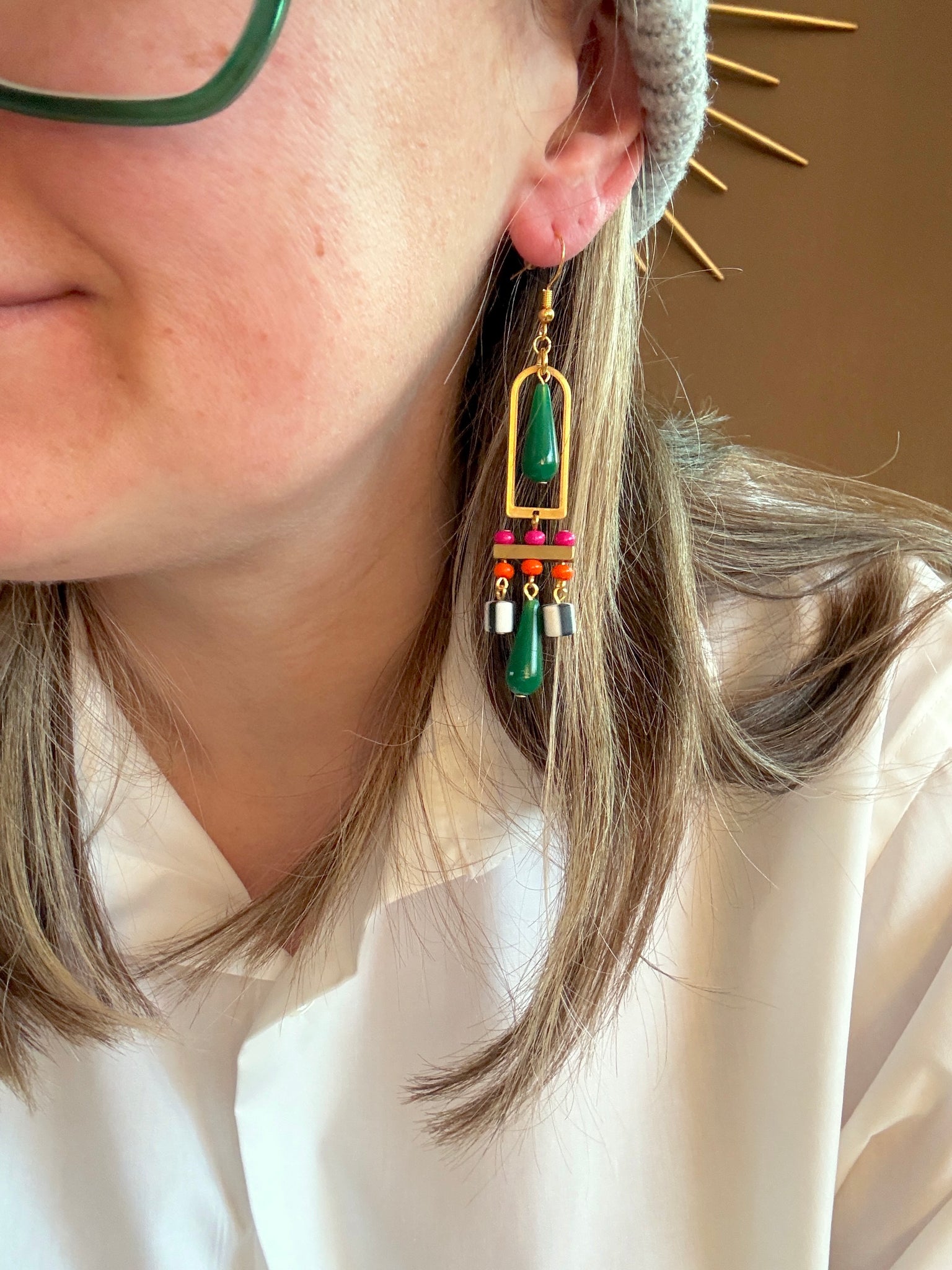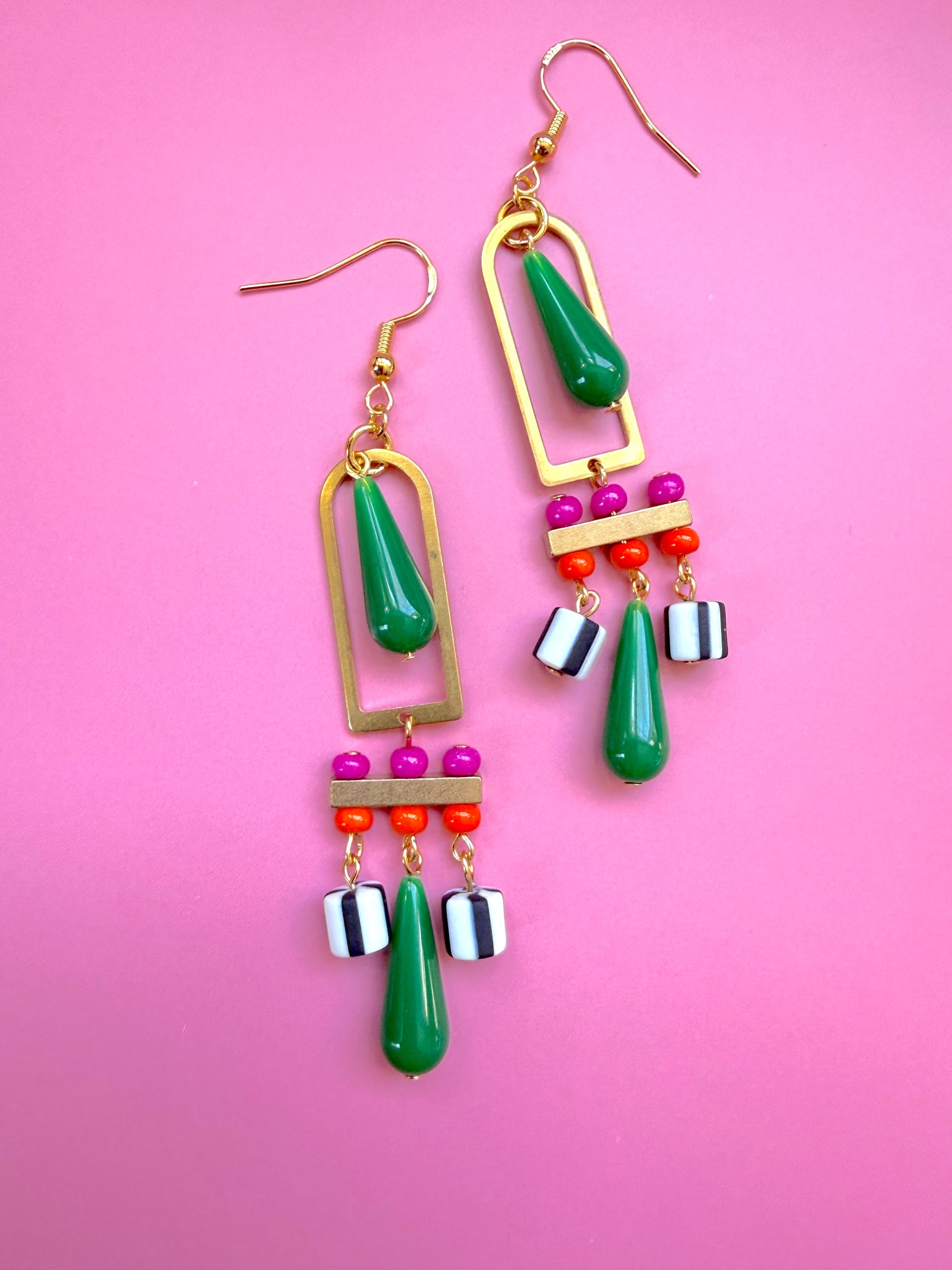 Surrounding the green teardrops are pops of dark pink and bright orange glass seed beads, adding warmth and contrast to the design. Graphic black and white striped beads bring a fun, modern accent that ties the colorful palette together.