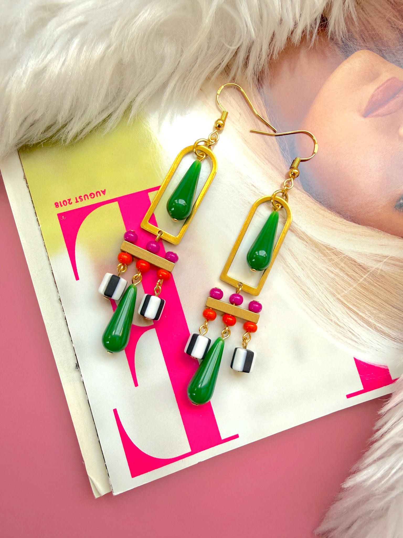 The combination of tropical greens, juicy pinks and oranges, and bold graphic stripes gives these earrings a fun, energetic personality — perfect for summer outfits, colorful wardrobes, or anyone who loves joyful jewelry.