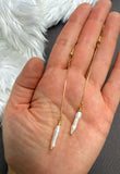 Introducing Pearl Whisper – the epitome of modern elegance. These minimalist earrings feature a single long stick freshwater pearl delicately suspended from a flowing gold-plated snake chain. The clean, linear design creates a graceful sway with every movement, making them perfect for both day and evening wear.