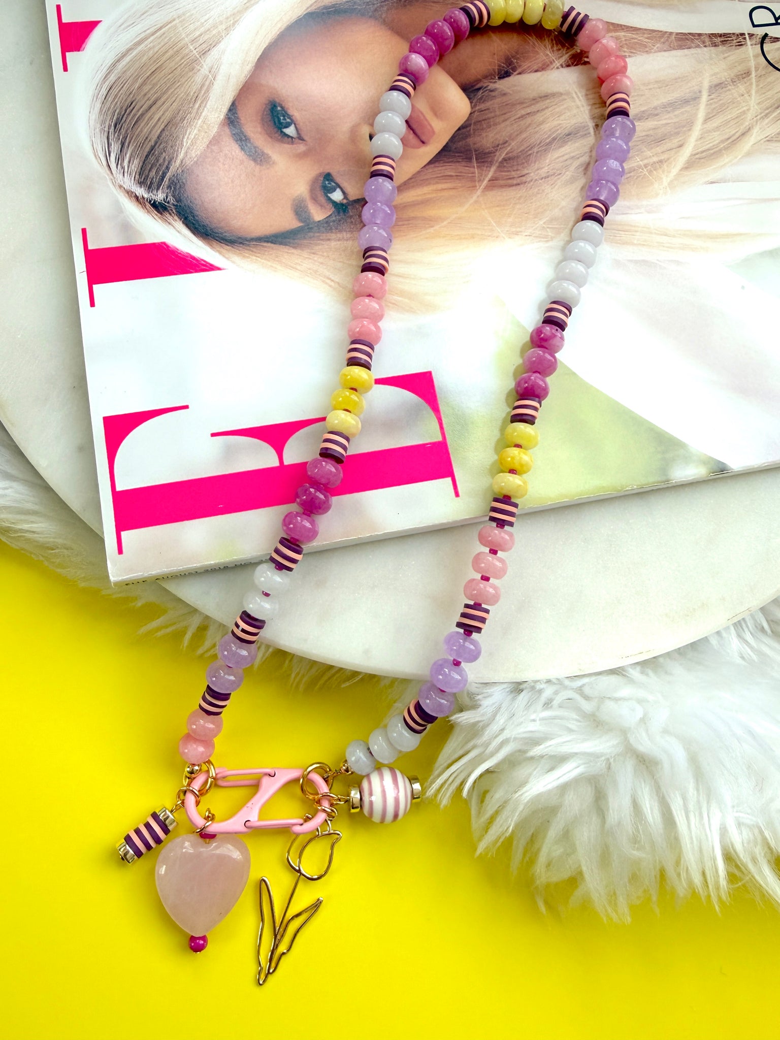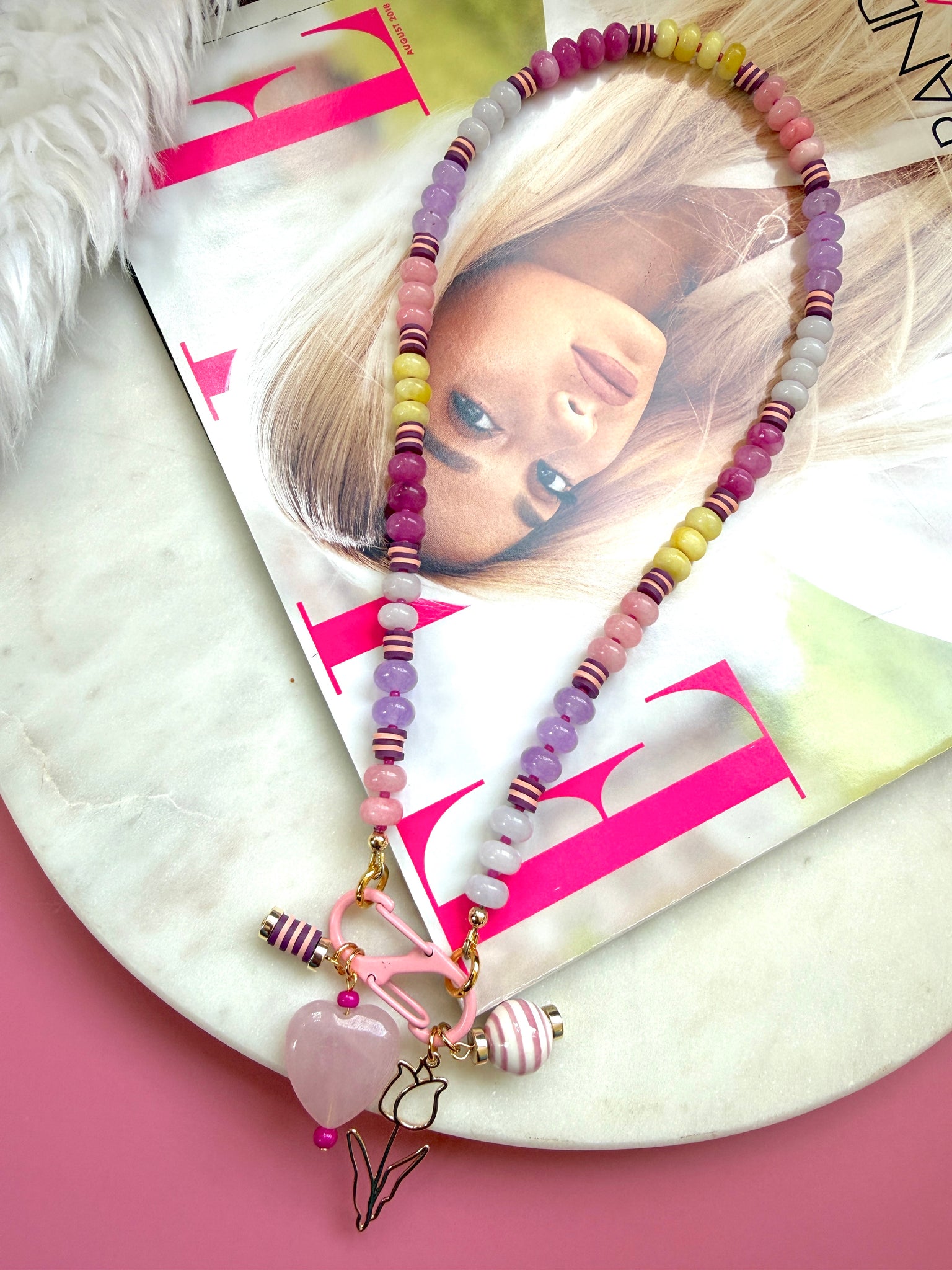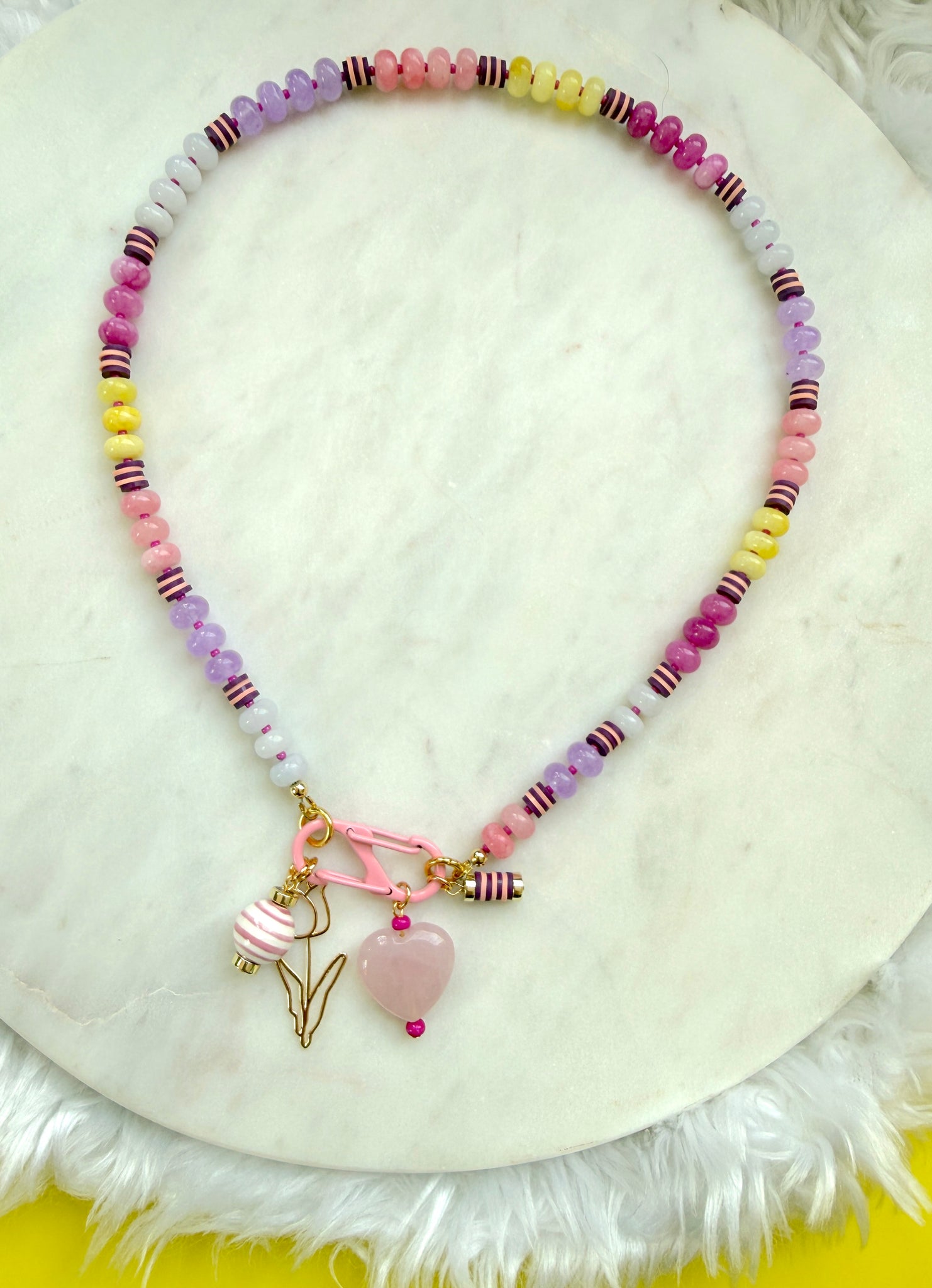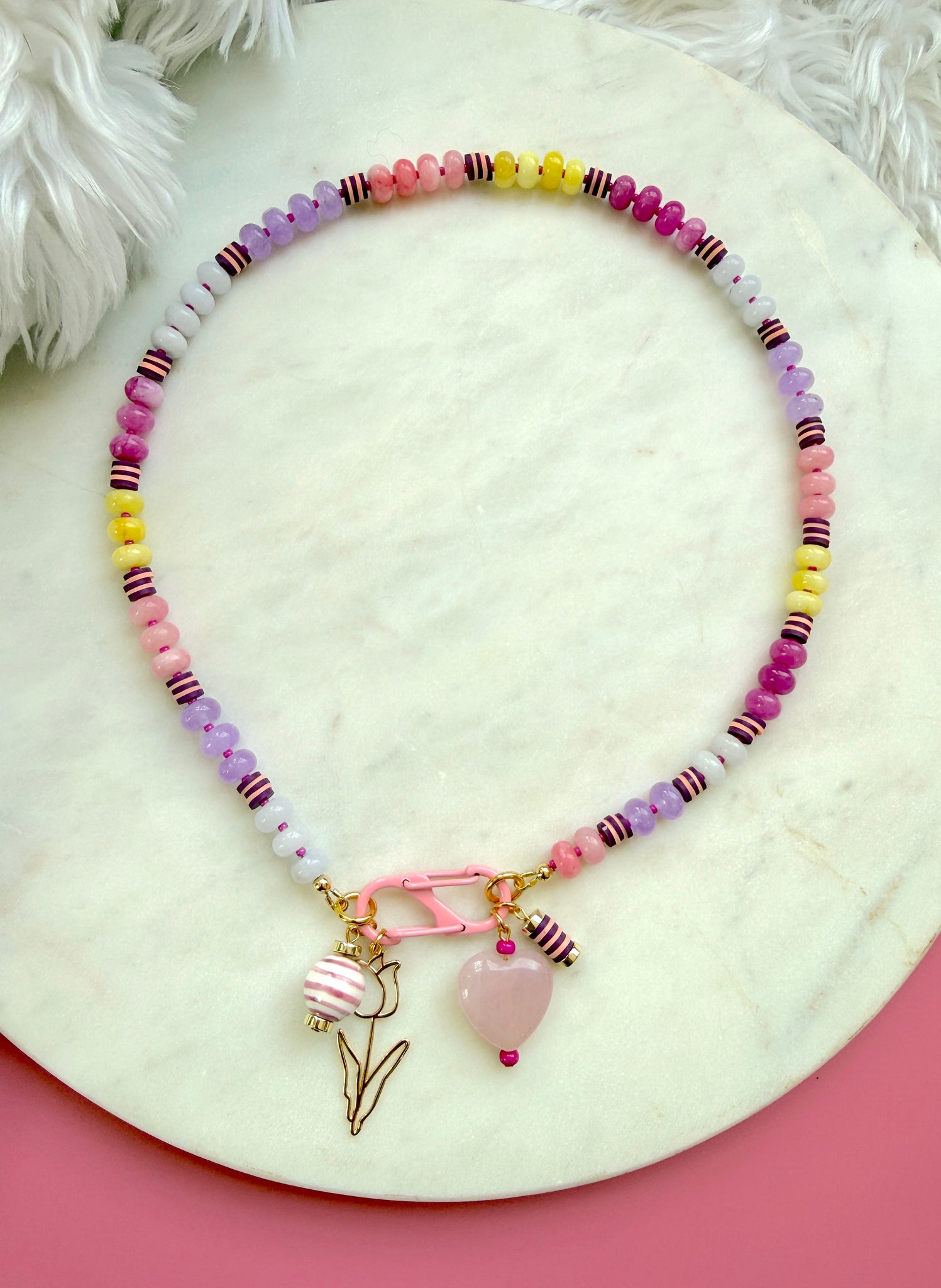 This 18 inch beaded necklace features a joyful mix of pink, yellow, and purple jade rondelle beads, accented with small “stripe” sections of polymer clay heishi beads for bursts of pattern and texture. Tiny dark pink seed beads sit between each section, adding extra dimension and rhythm throughout the strand.