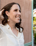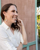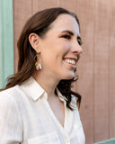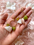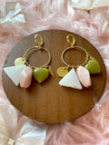 These gold-plated hoop earrings feature unique bead charms including a Rose Quartz bead, White Quartz triangle, Chrysoprase hearts, and gold pendants. Please see below to see what these gemstone charms represent.
