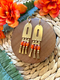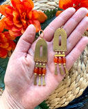 These are large, brass, chandelier statement earrings featuring orange agate beads. These are dramatic and unique, and will definitely be a conversation starter.