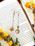These are delicate, bohemian celestial earrings featuring sun and moon pendants and Swarovski crystal birthstone connectors.