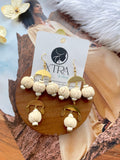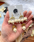 This collection is inspired by light. I wanted to create a white, neutral based collection that mixed several textures and felt light and airy. The key components include white howlite spikes, hand carved Nepalese bone beads, rattan, raffia and metallic accents. Each piece is lovingly designed and crafted by hand.