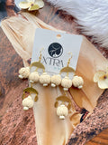 This listing is for large, beaded, dangly statement earrings featuring rattan beads, bone button beads and raw brass components.