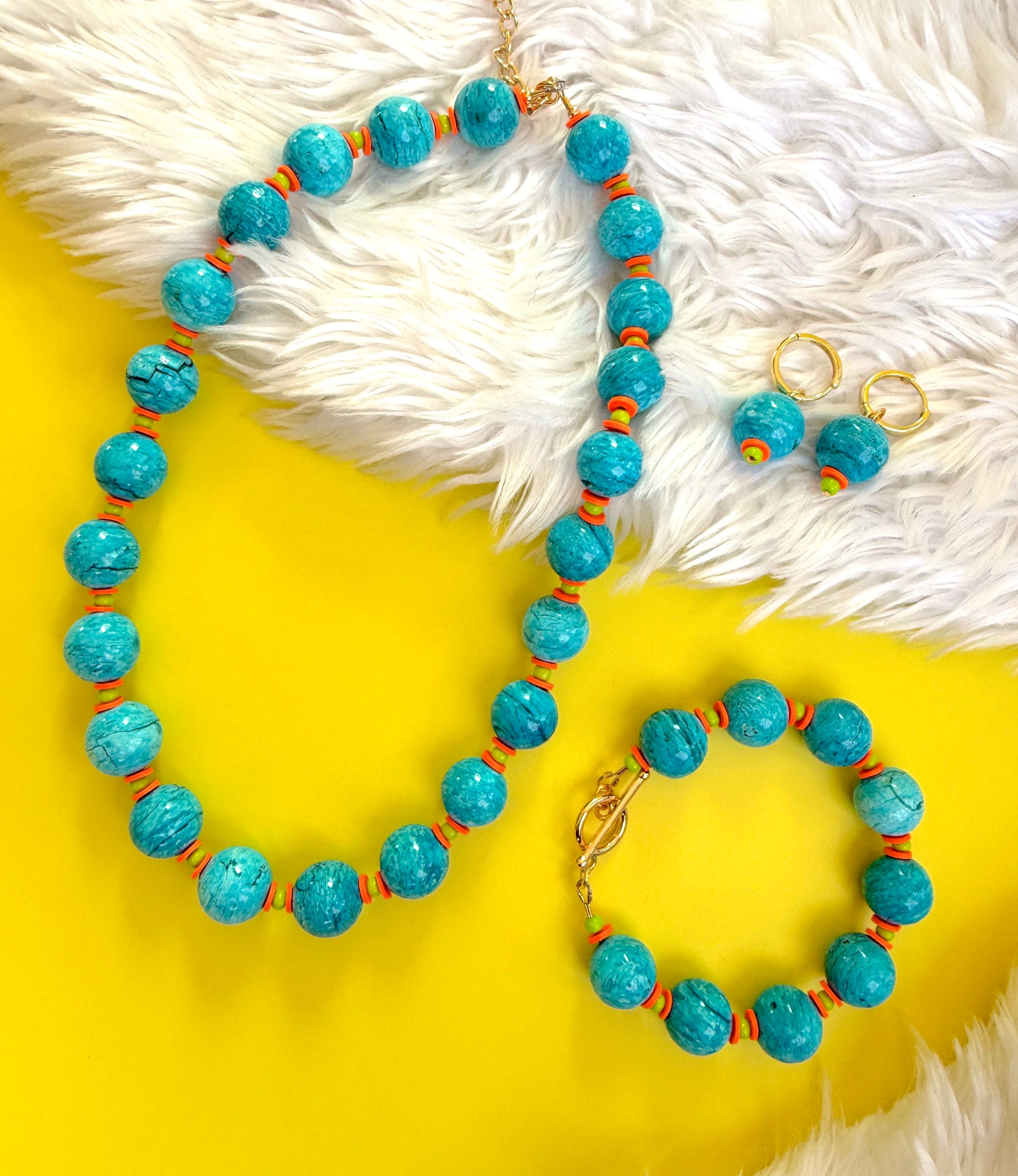 Pair them with the Turquoise Splash Necklace or Turquoise Splash Bracelet for a bold coordinated look.