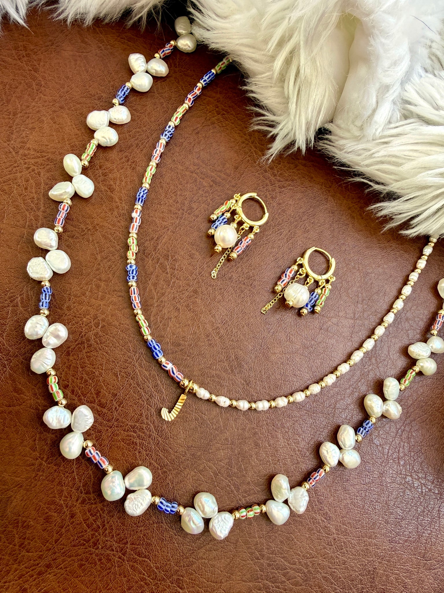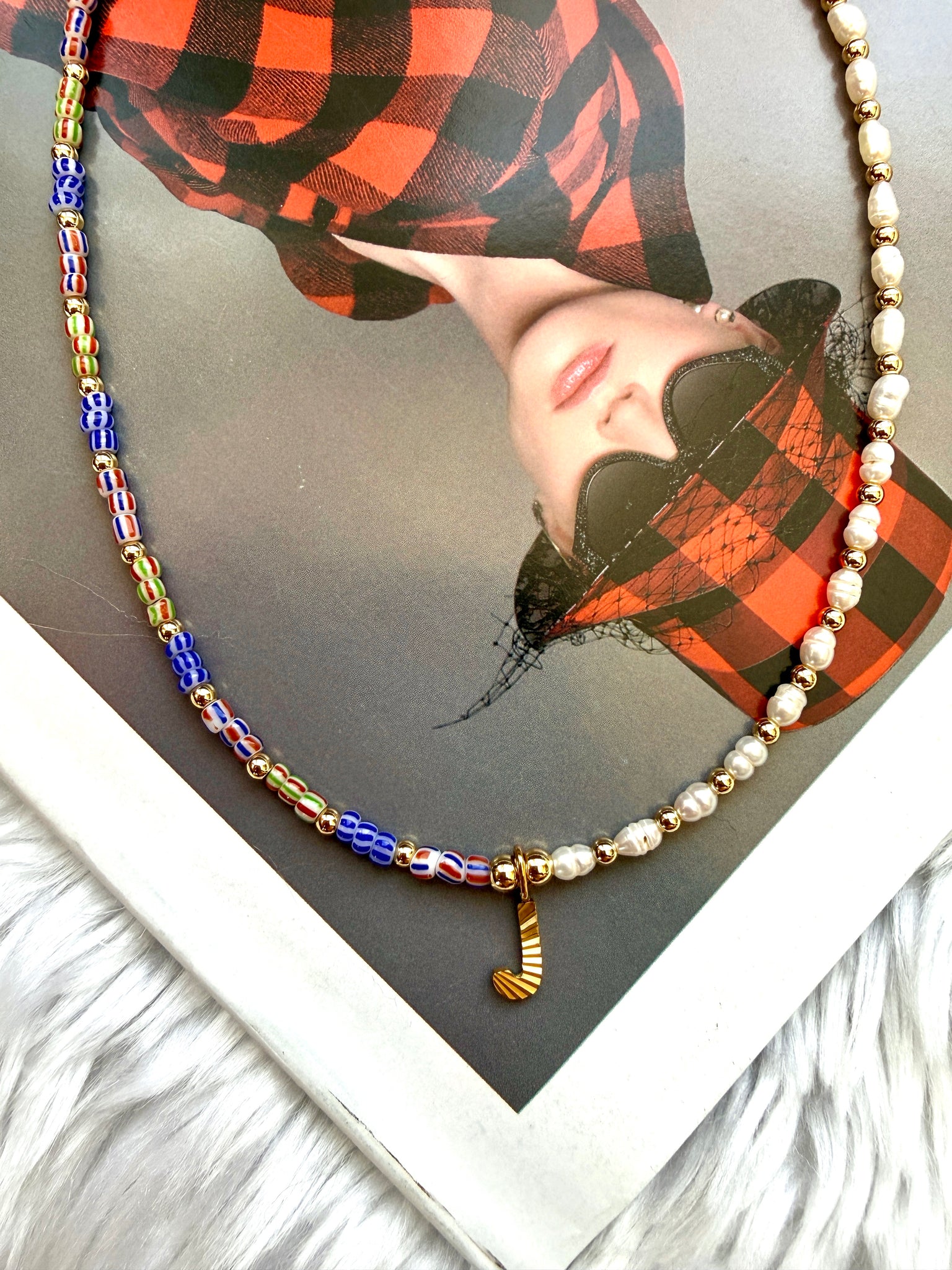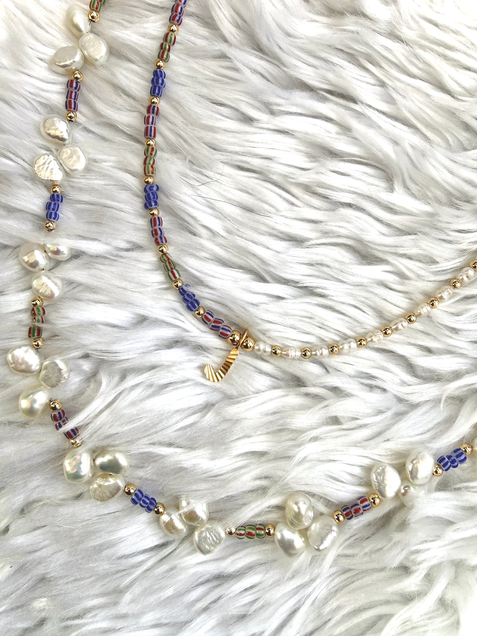 The Mariner Initial Necklace blends nautical-inspired color with timeless pearls and a personalized centerpiece. This delicate 14-inch necklace features a balanced design: striped glass beads on one side and freshwater pearls on the other, creating a playful contrast of color and texture.