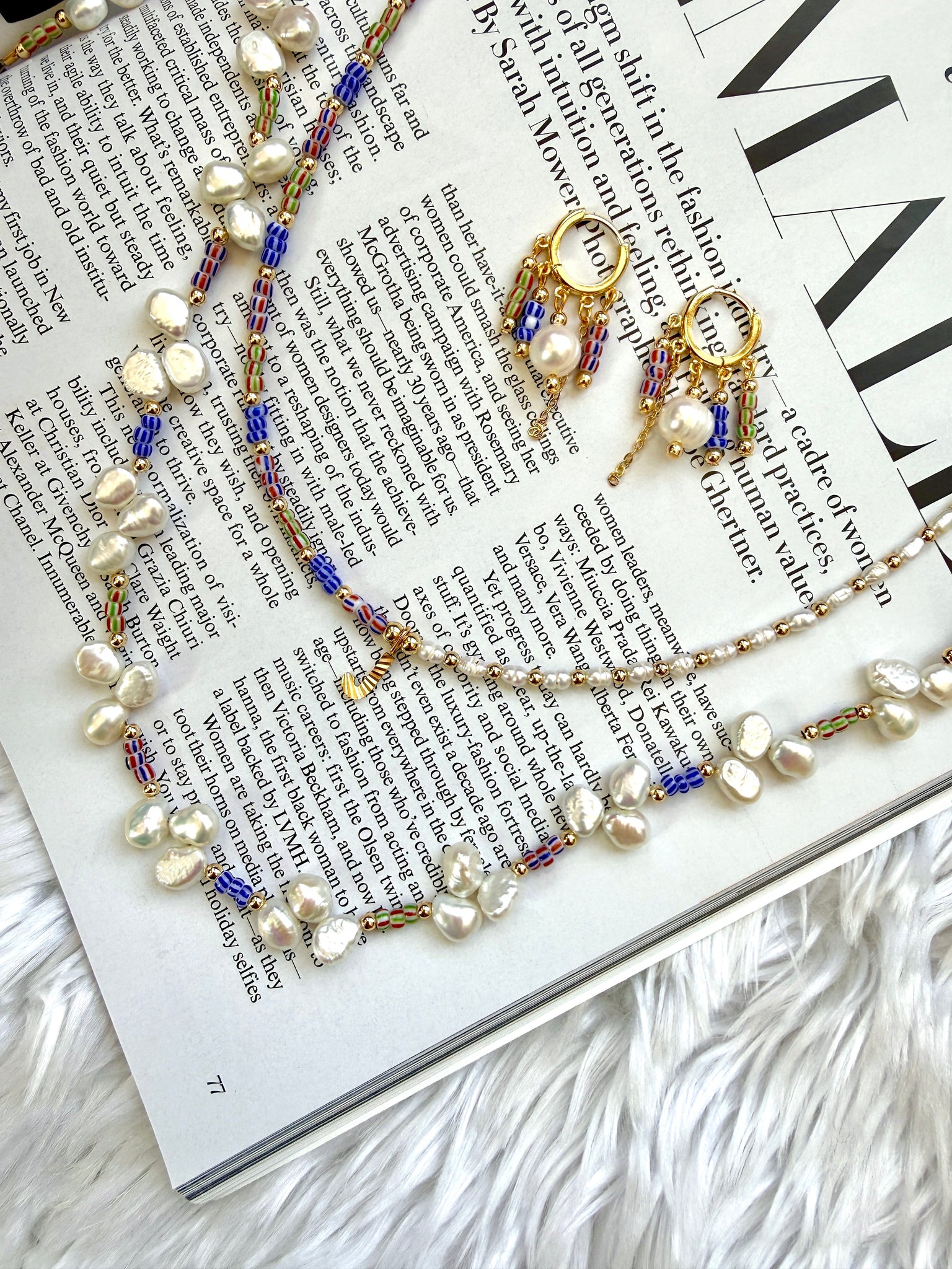 The mix of pearls, striped beads, and gold accents gives the piece a subtle maritime feel while remaining refined and versatile enough for everyday wear.