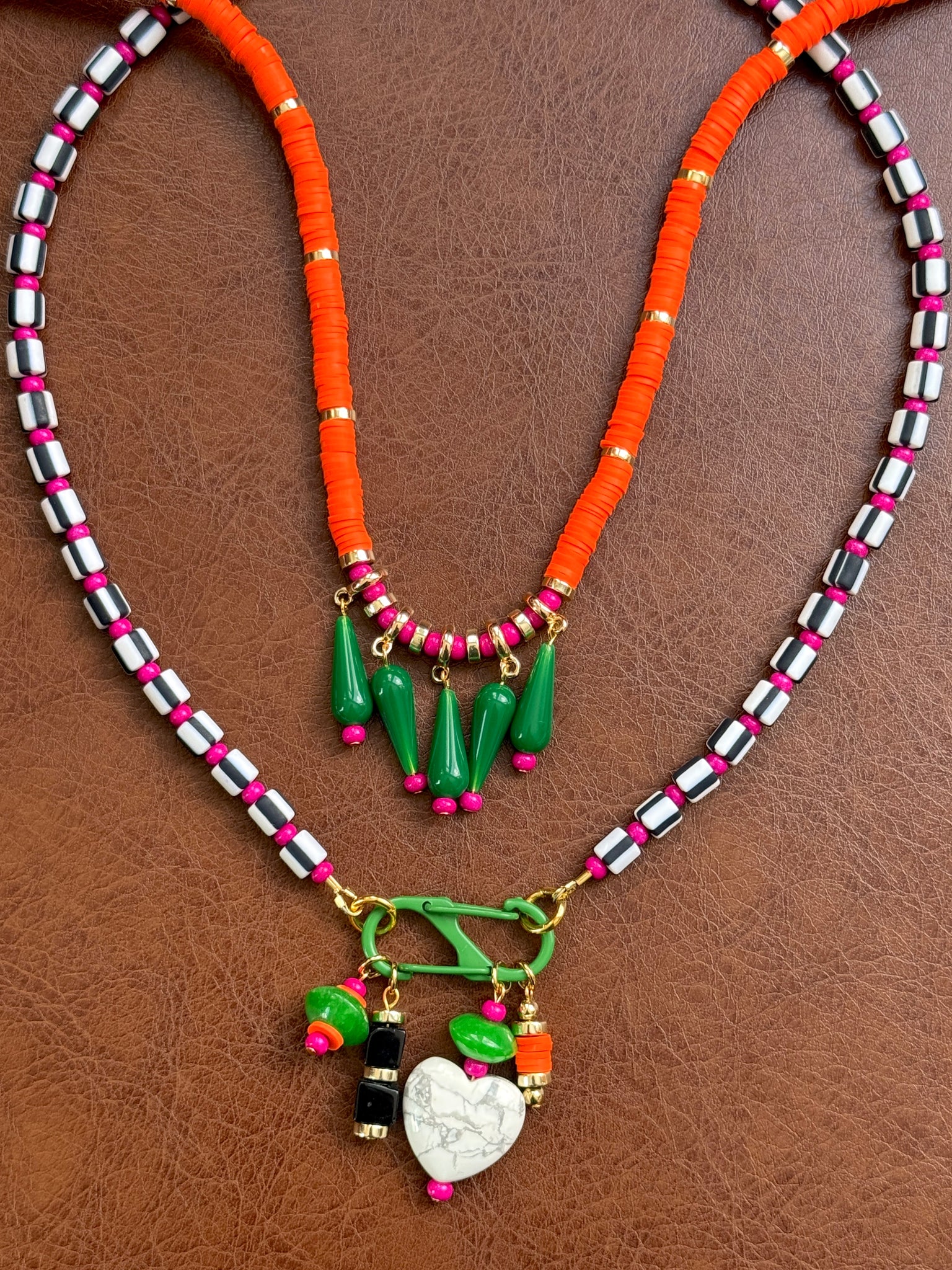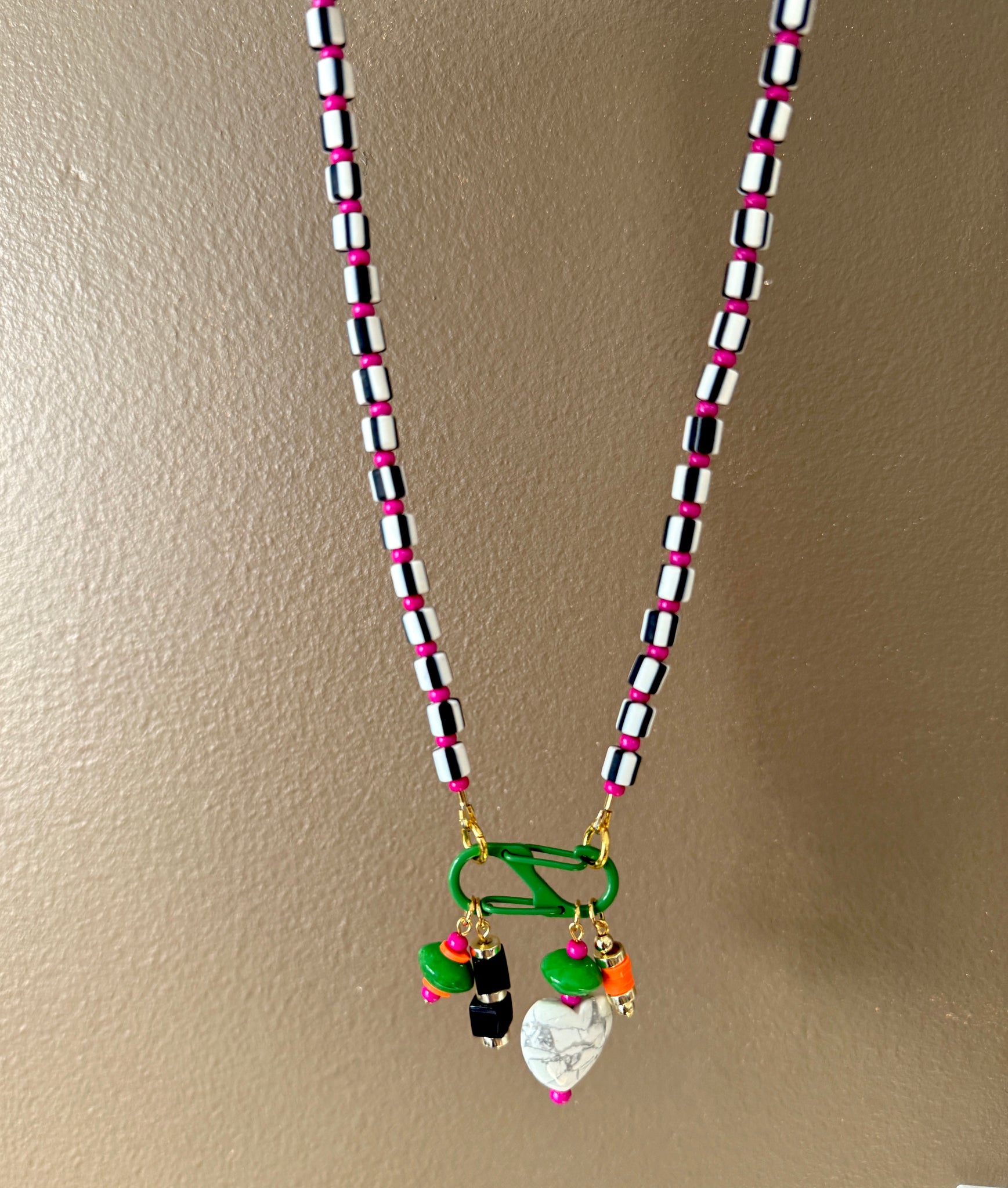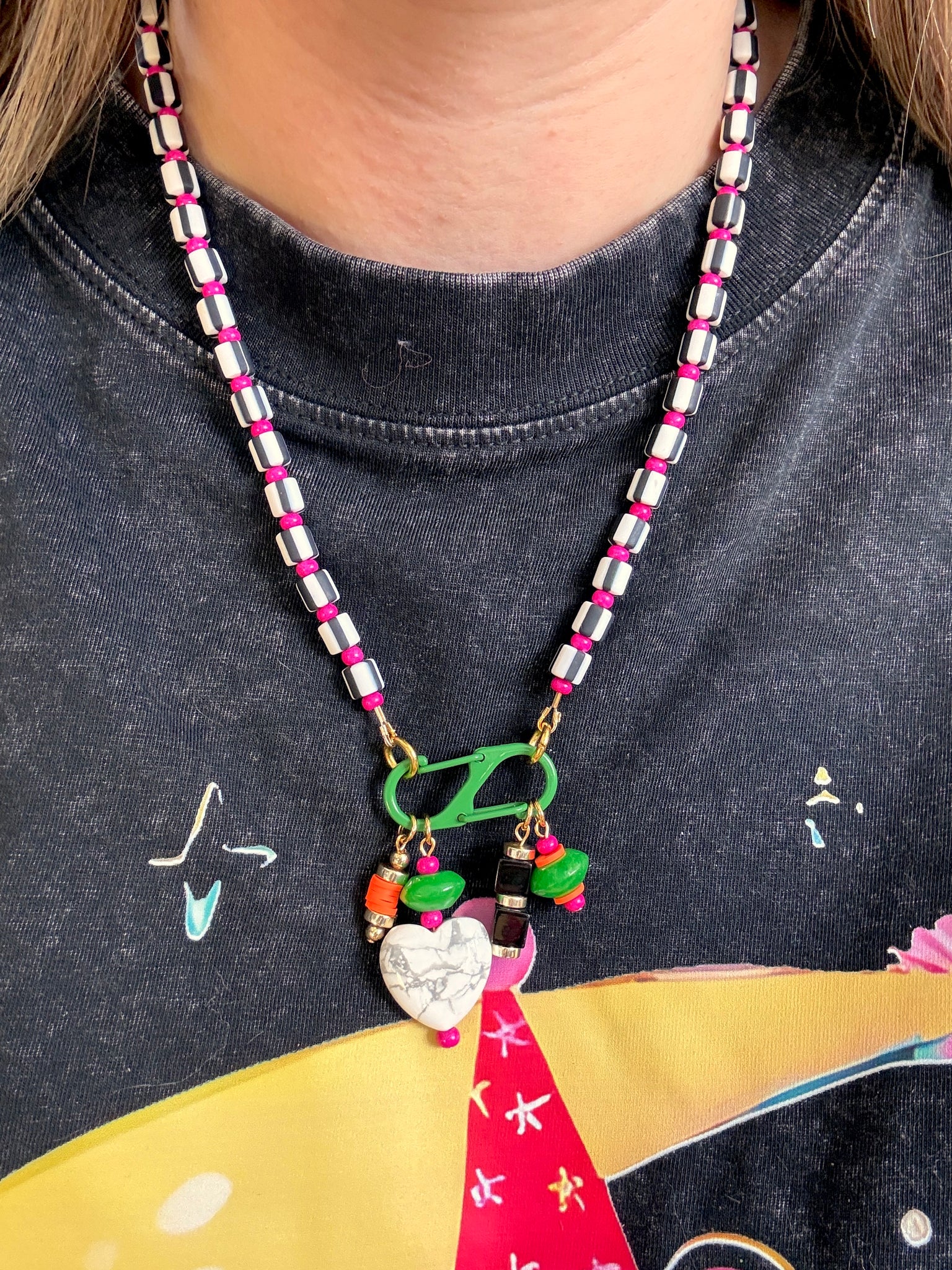 The Graphic Clash Necklace is a charm-forward statement piece designed to mix, match, and evolve with your style. Featuring a graphic palette of black, white, and bright pink beads, this necklace is anchored by a striking green carabiner clasp that holds a collection of removable charms.