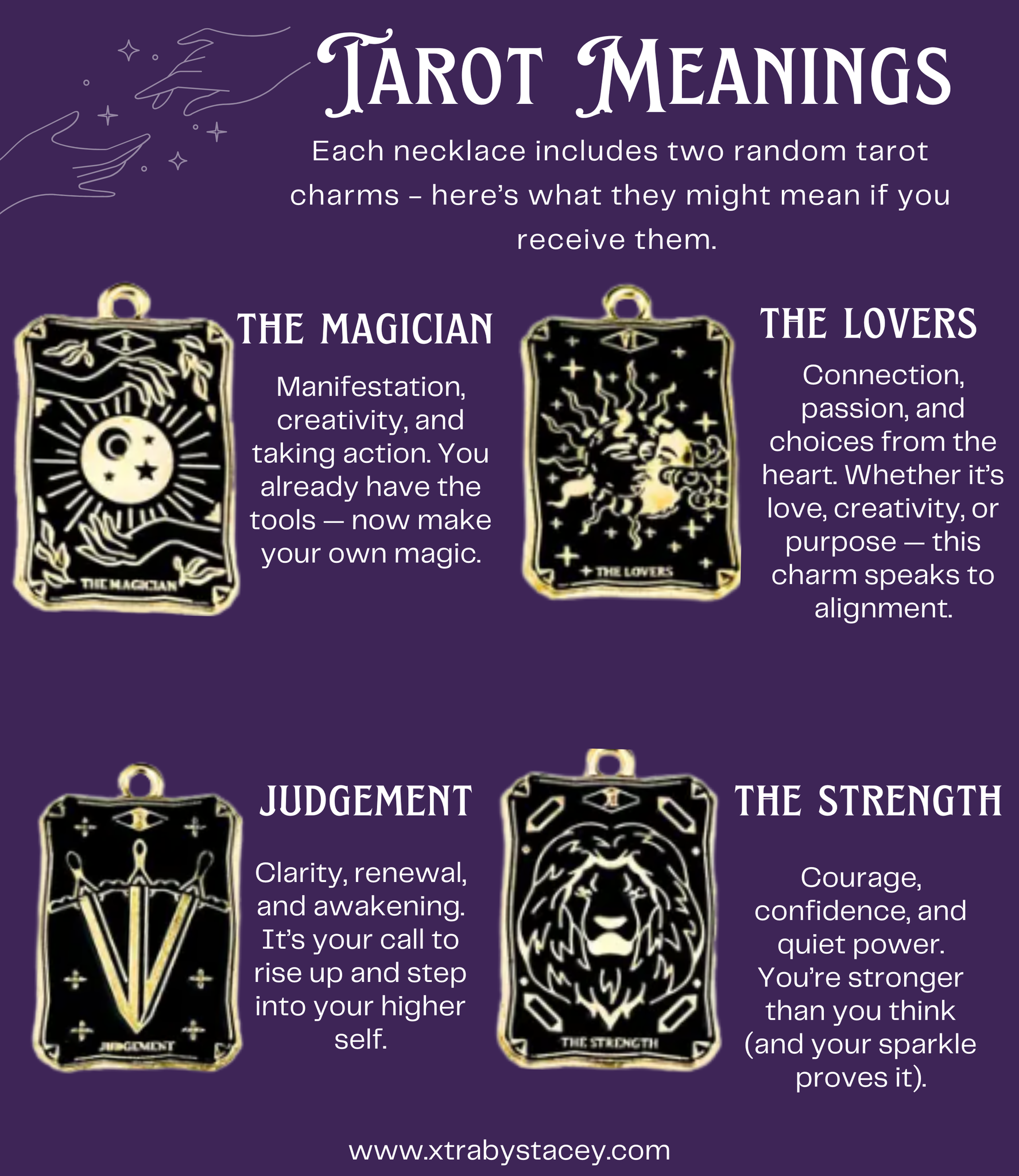 Every necklace includes two random tarot charms, so no two pieces are exactly alike. Your Midnight Mystique necklace will carry its own unique energy and story — just like you. ✨