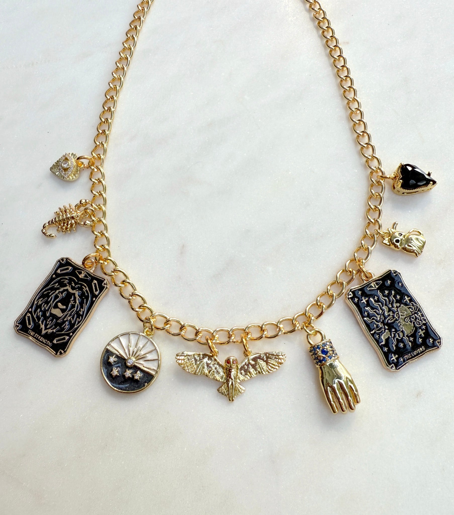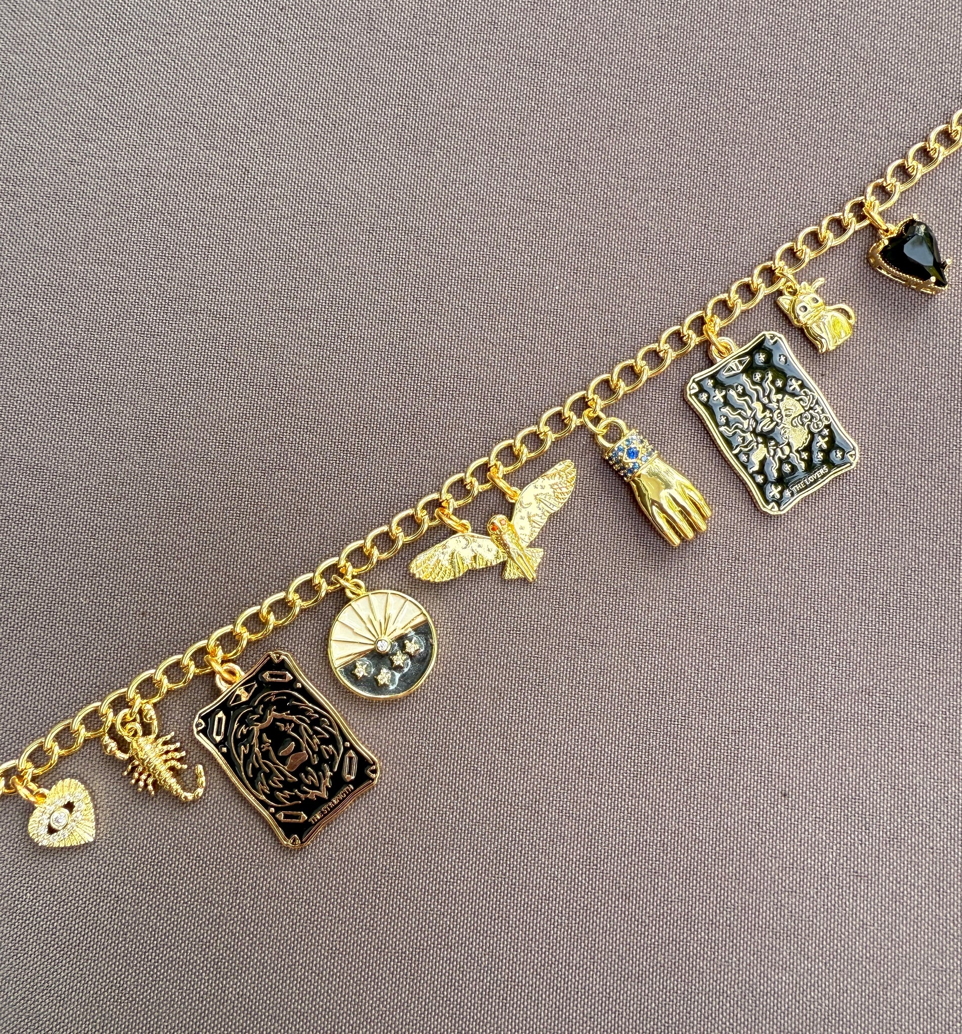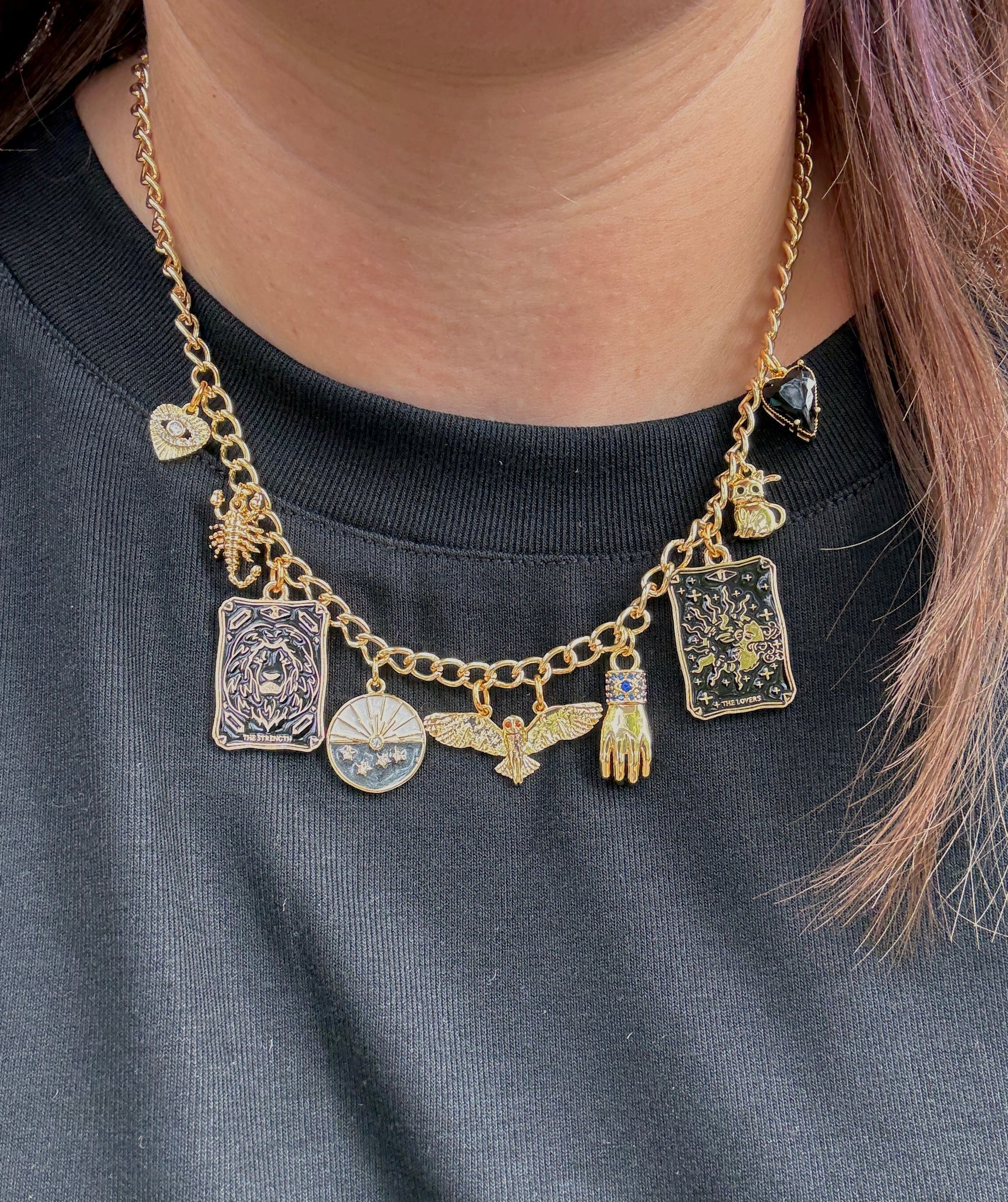 This enchanting 17-inch gold-plated necklace (with a 3-inch extender) features a curated mix of mystical charms: an evil eye heart, scorpion, two tarot cards, eclipse, owl, protective hand amulet, black cat with jet eyes, and a black heart. Each charm was chosen for its symbolic meaning — wisdom, mystery, protection, and fate.