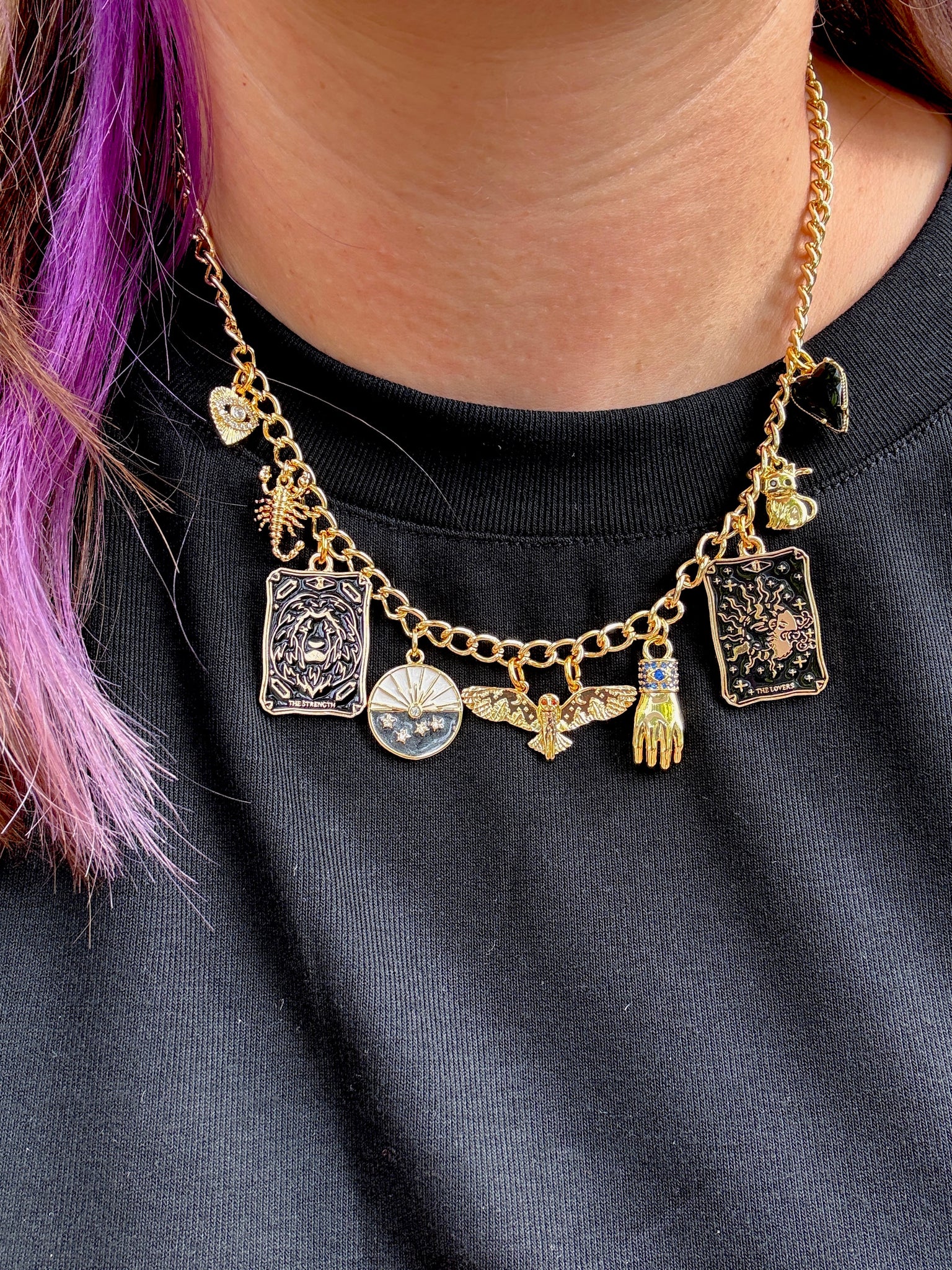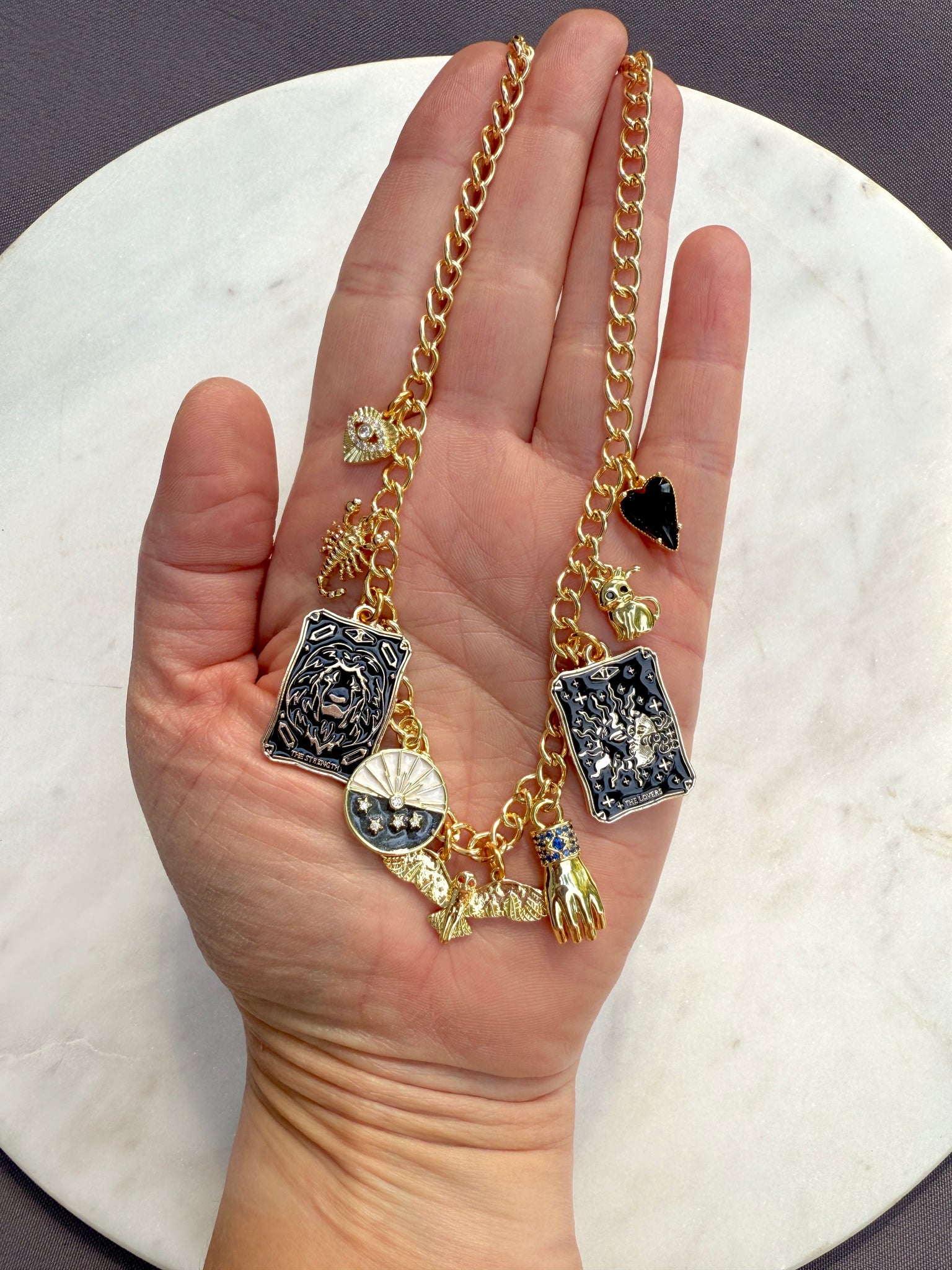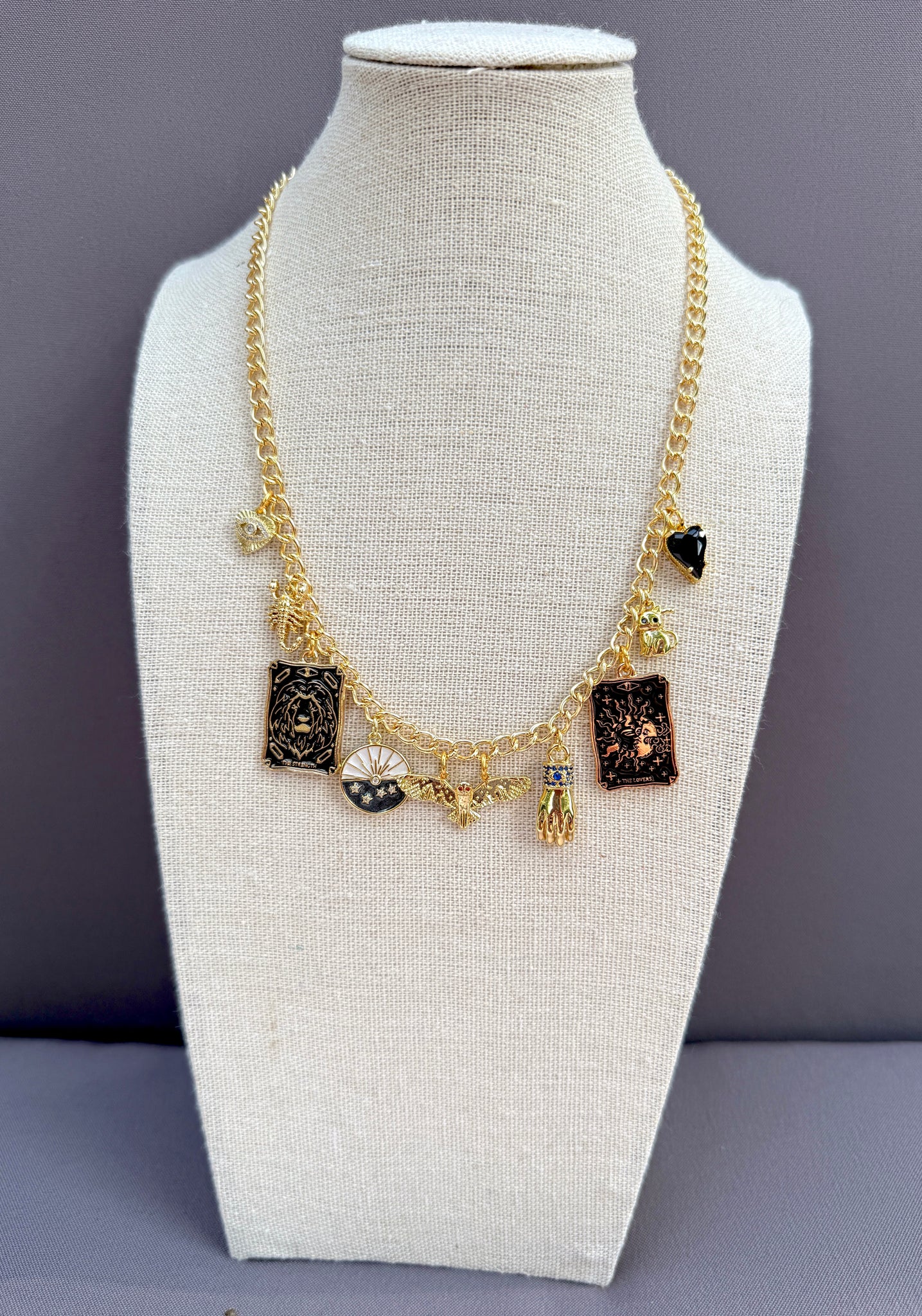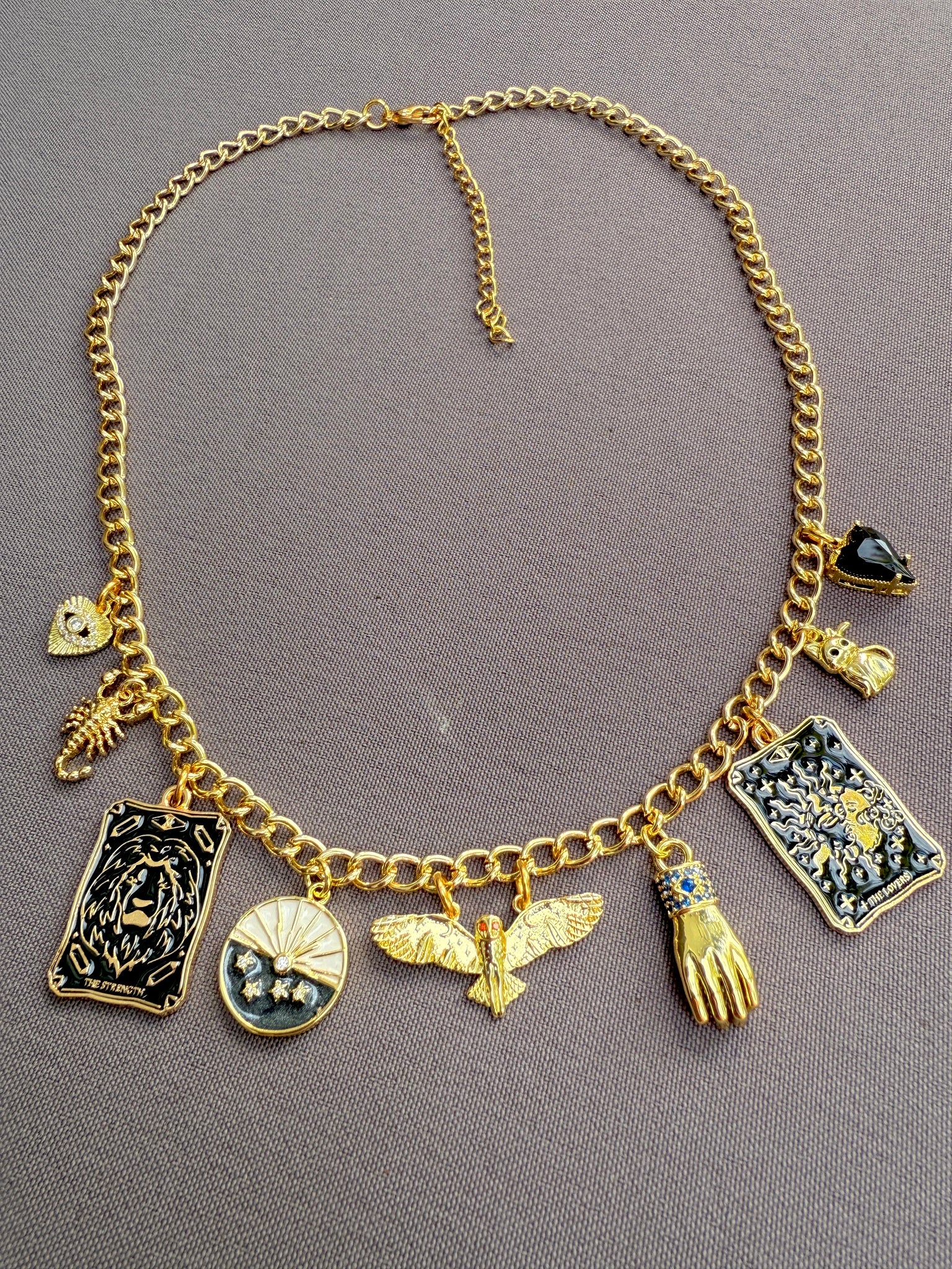 This enchanting 17-inch gold-plated necklace (with a 3-inch extender) features a curated mix of mystical charms: an evil eye heart, scorpion, two tarot cards, eclipse, owl, protective hand amulet, black cat with jet eyes, and a black heart. Each charm was chosen for its symbolic meaning — wisdom, mystery, protection, and fate.