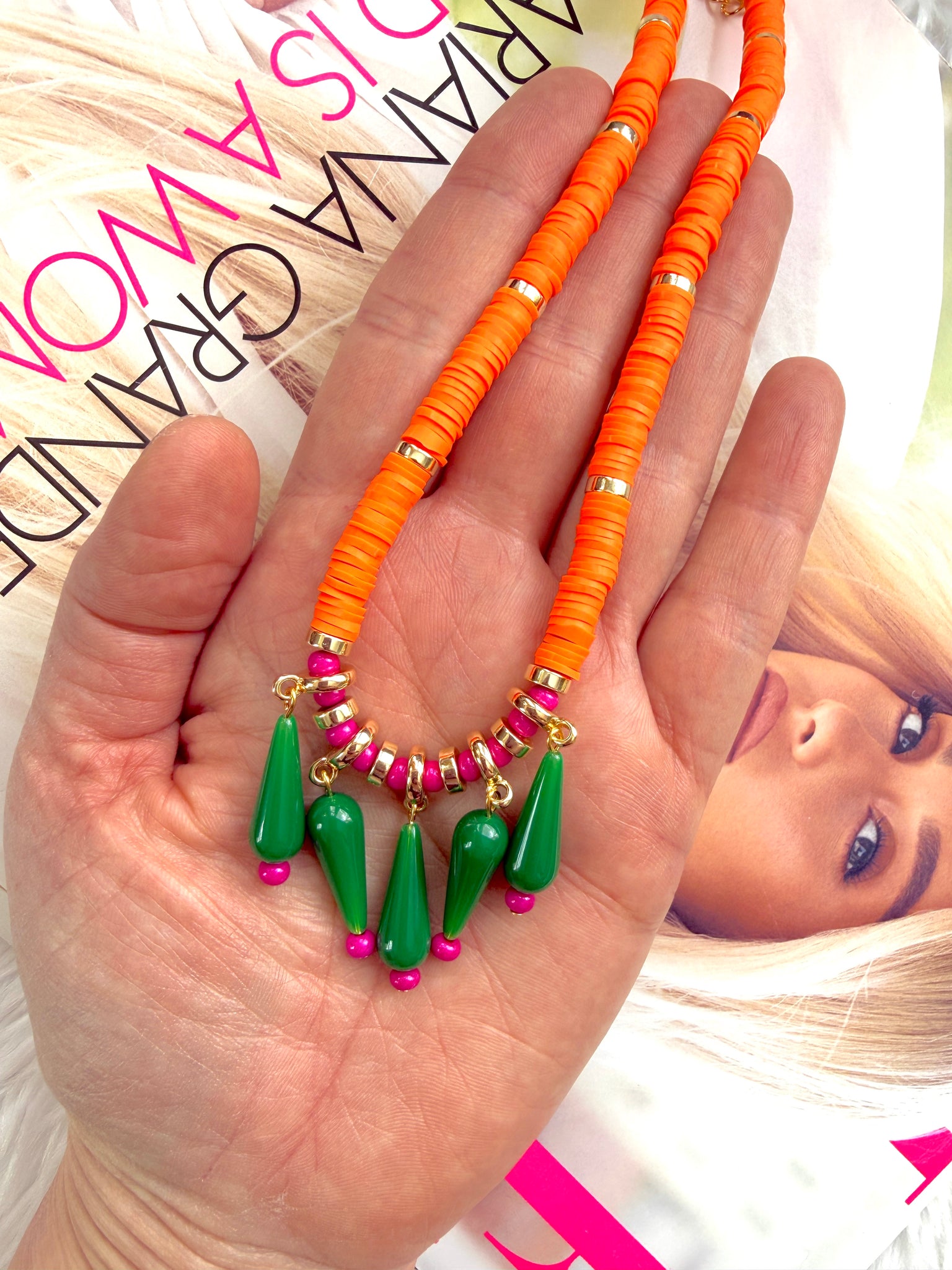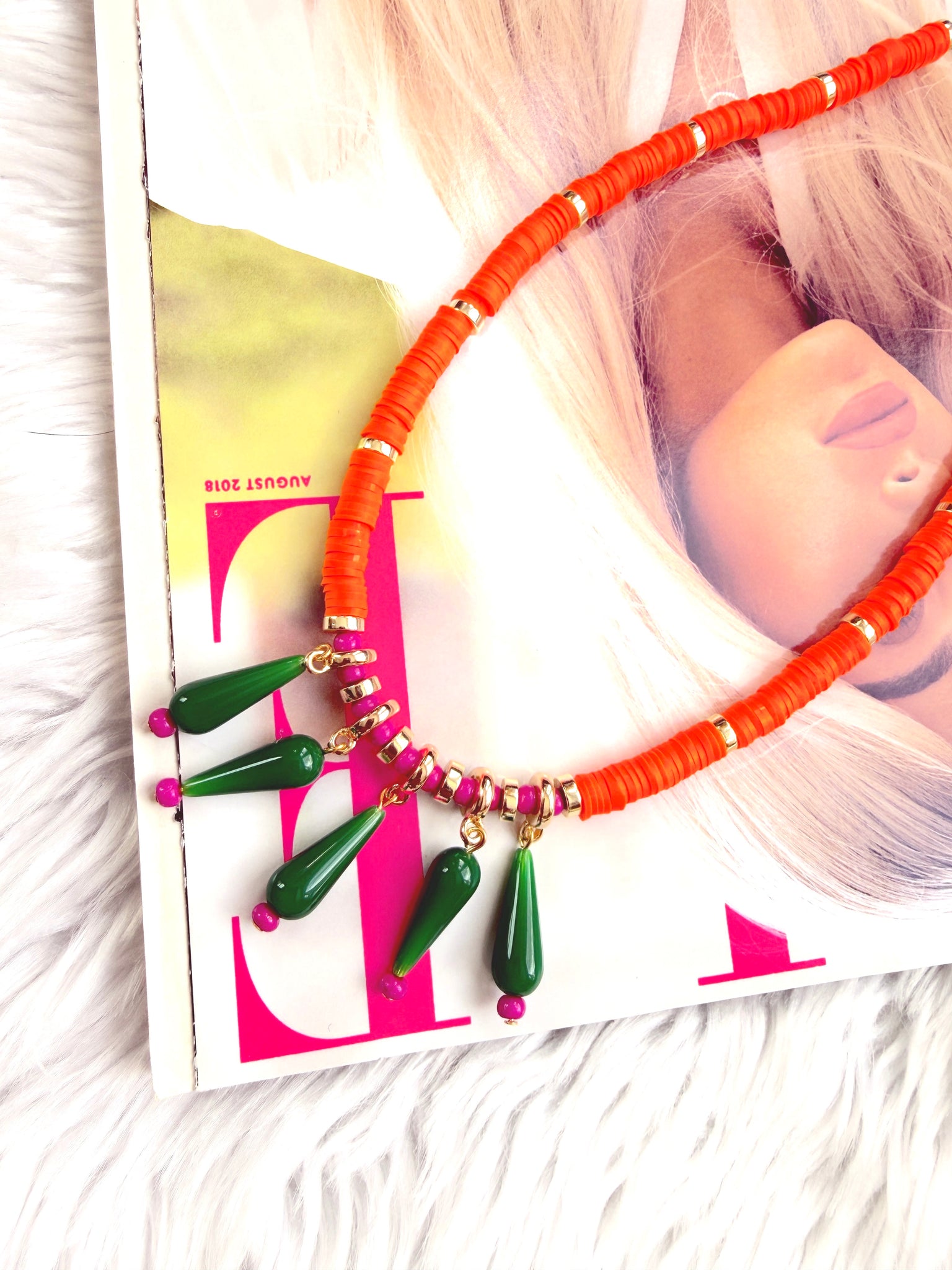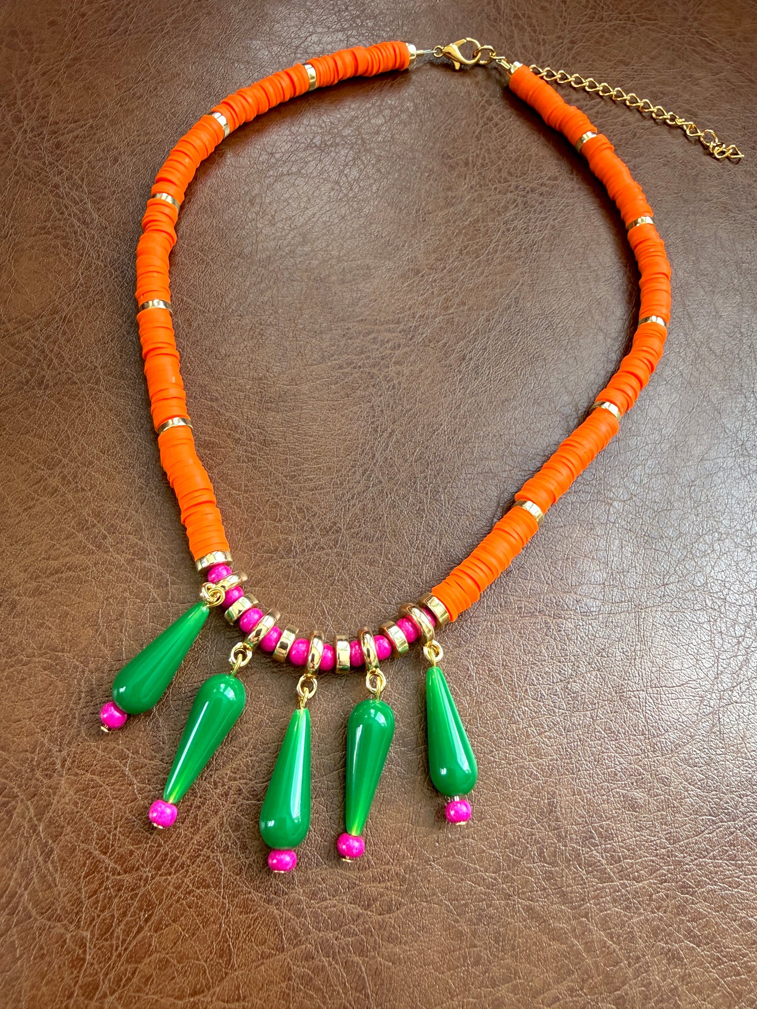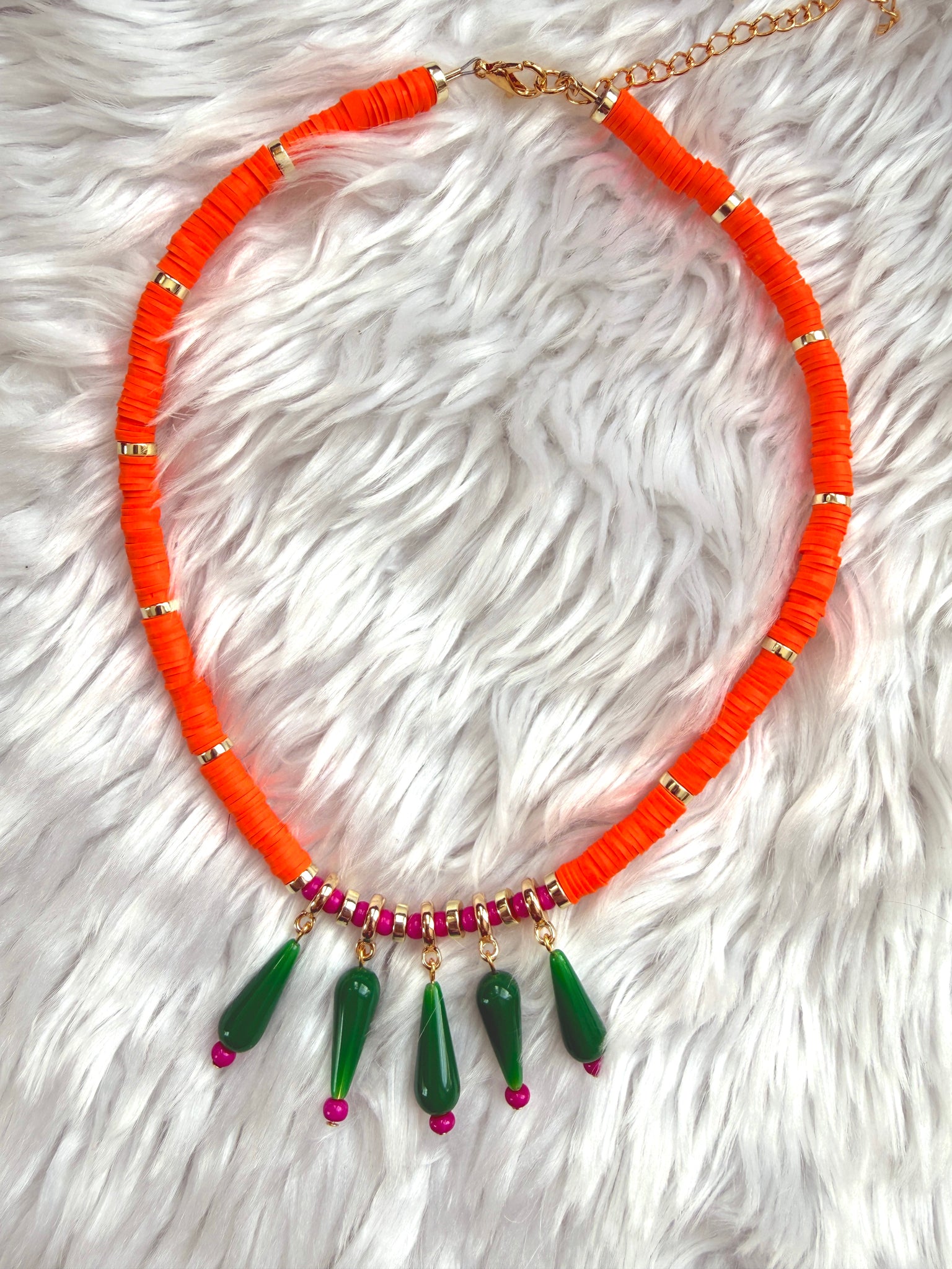 The Color Clash Necklace is a bright, playful statement designed for lovers of bold color and unexpected combinations. The strand is composed of neon orange polymer clay beads separated by gold heishi spacers, creating a vibrant base that instantly catches the eye.