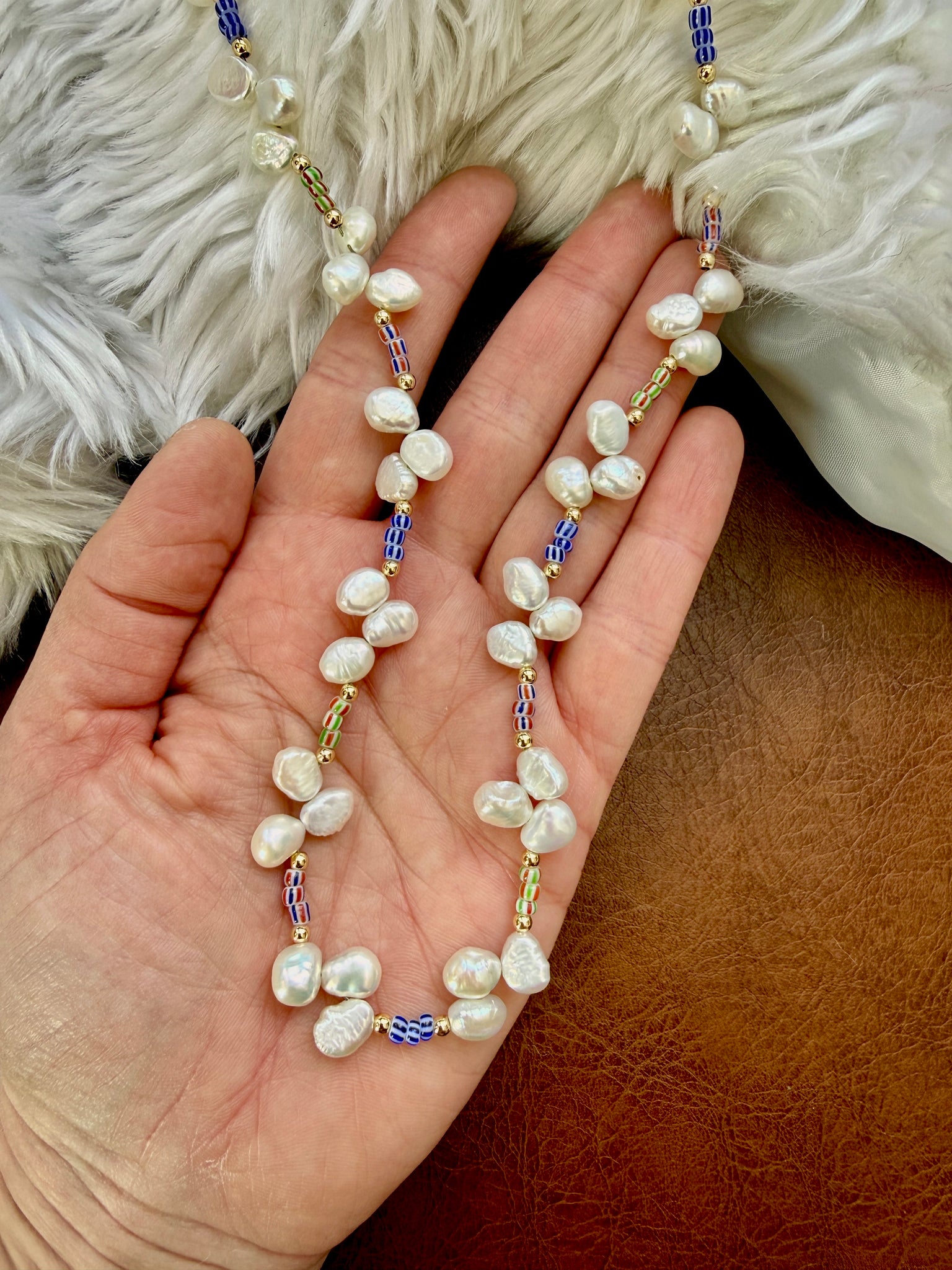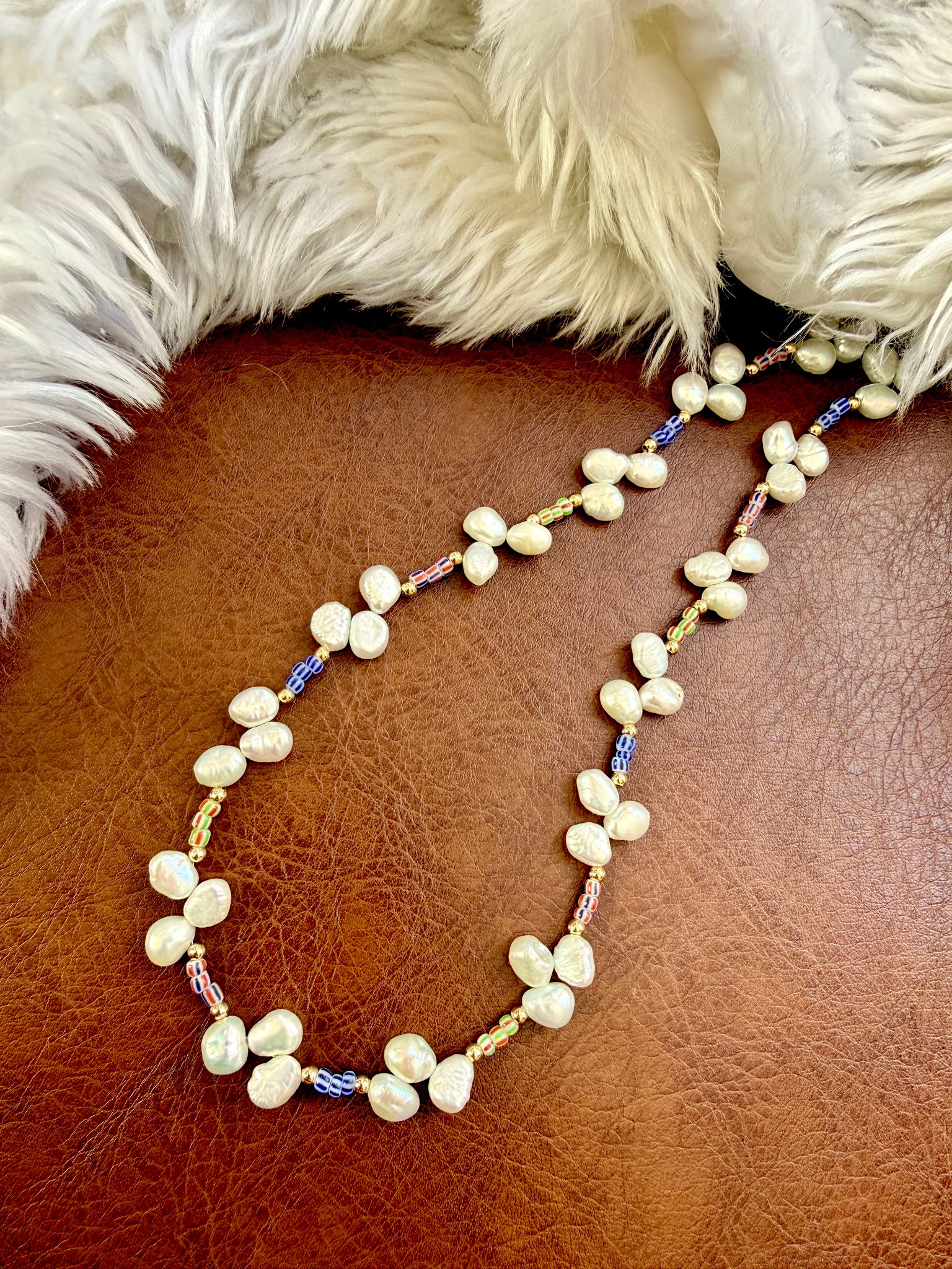 The Mariner Collar Necklace pairs timeless freshwater pearls with playful striped glass beads in a design that feels both striking and effortlessly wearable. Along the strand, colorful striped beads alternate with trios of side-drilled freshwater pearls, creating a rhythm of color, texture, and soft luster.