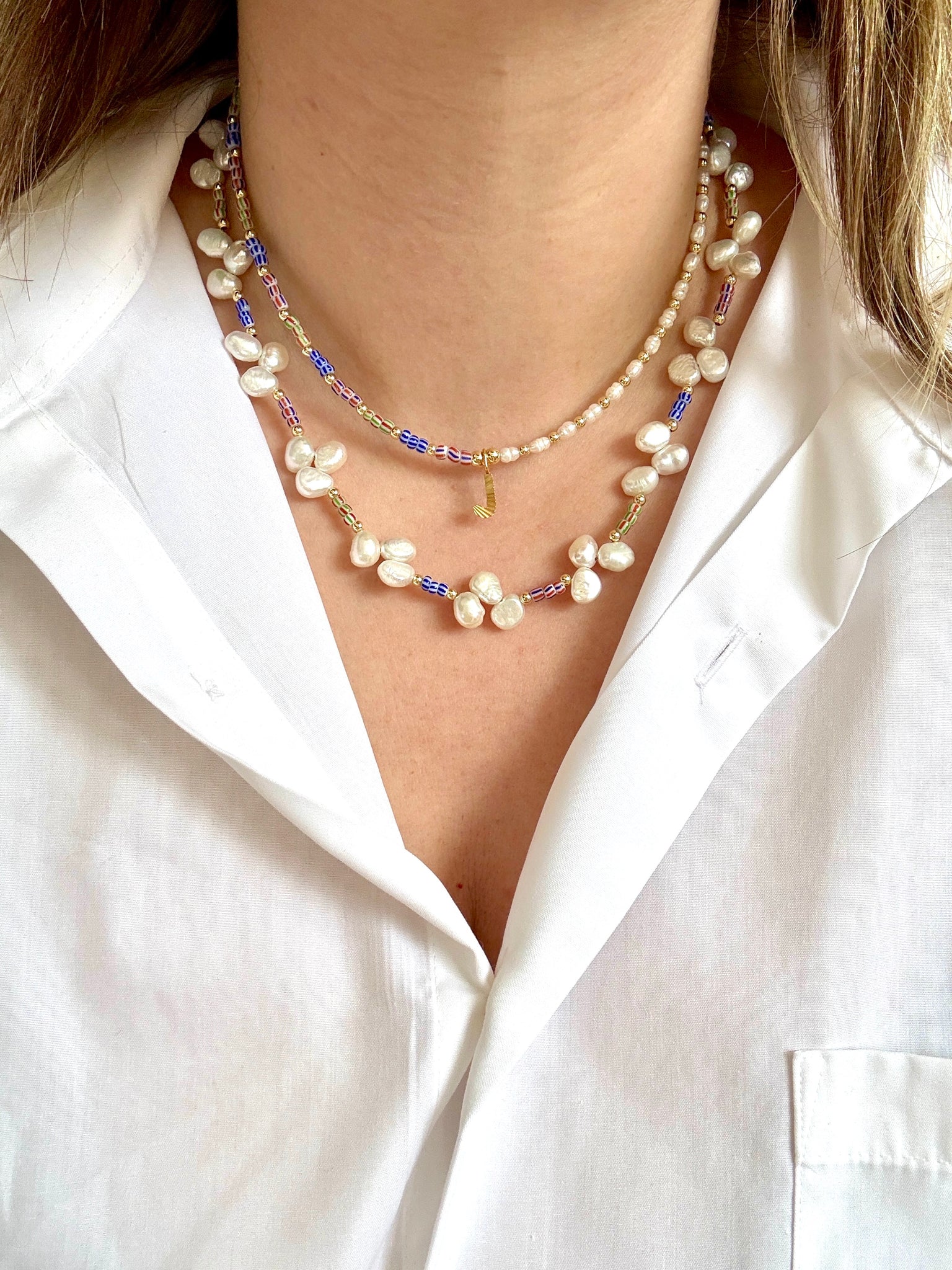 The Mariner Collar Necklace blends colorful maritime-inspired stripes with luminous freshwater pearls, making it a versatile piece that works equally well with everyday outfits or layered styling. Wear it on its own for a statement collar or pair it with the Mariner Initial Necklace for a personalized layered look.