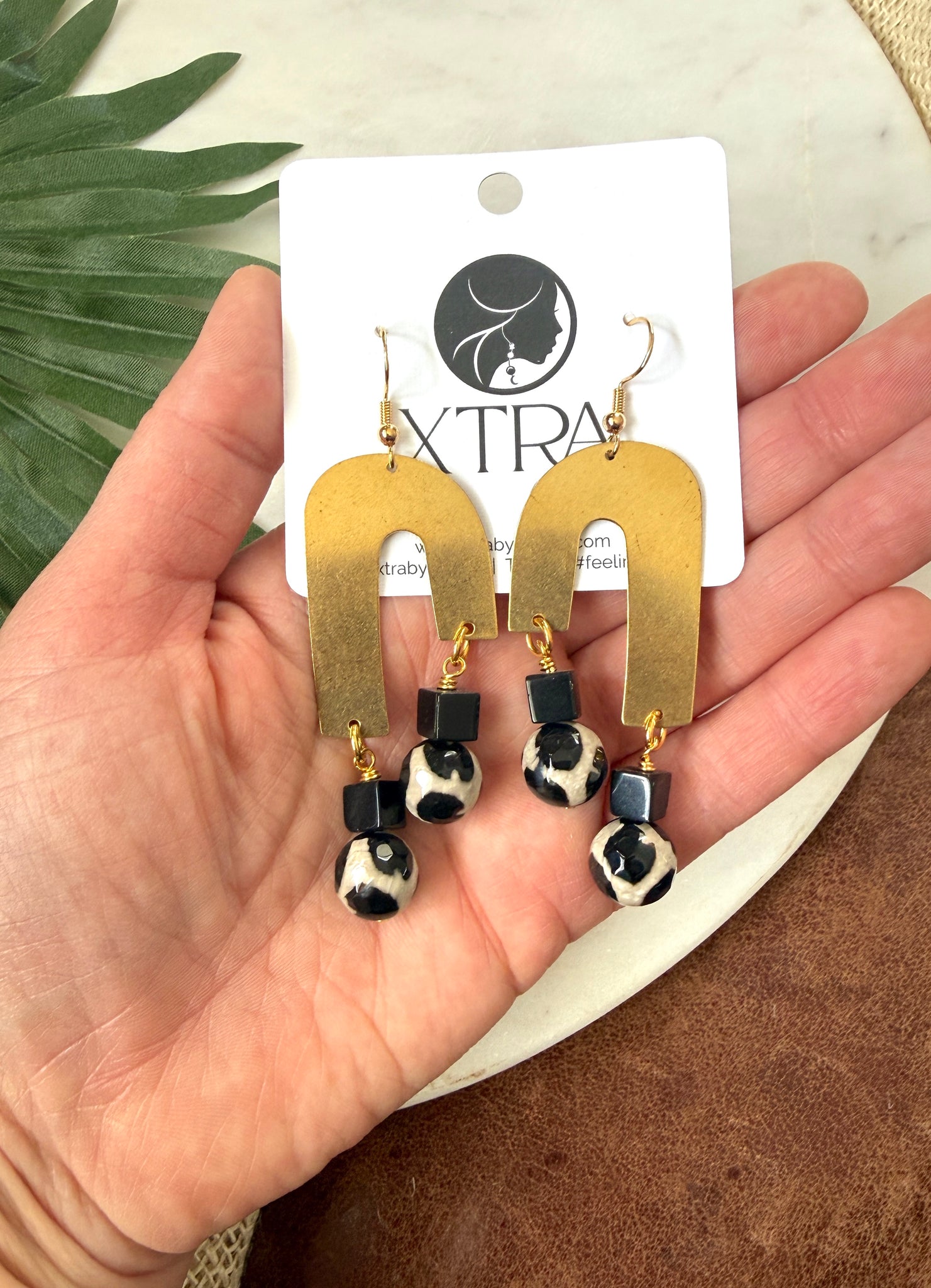 The Arch Theory Earrings are sculptural statement earrings inspired by architectural form and balance. A large brass arch anchors the design, while black cube beads and black-and-white spotted Tibetan agate pendants create striking visual rhythm and movement.