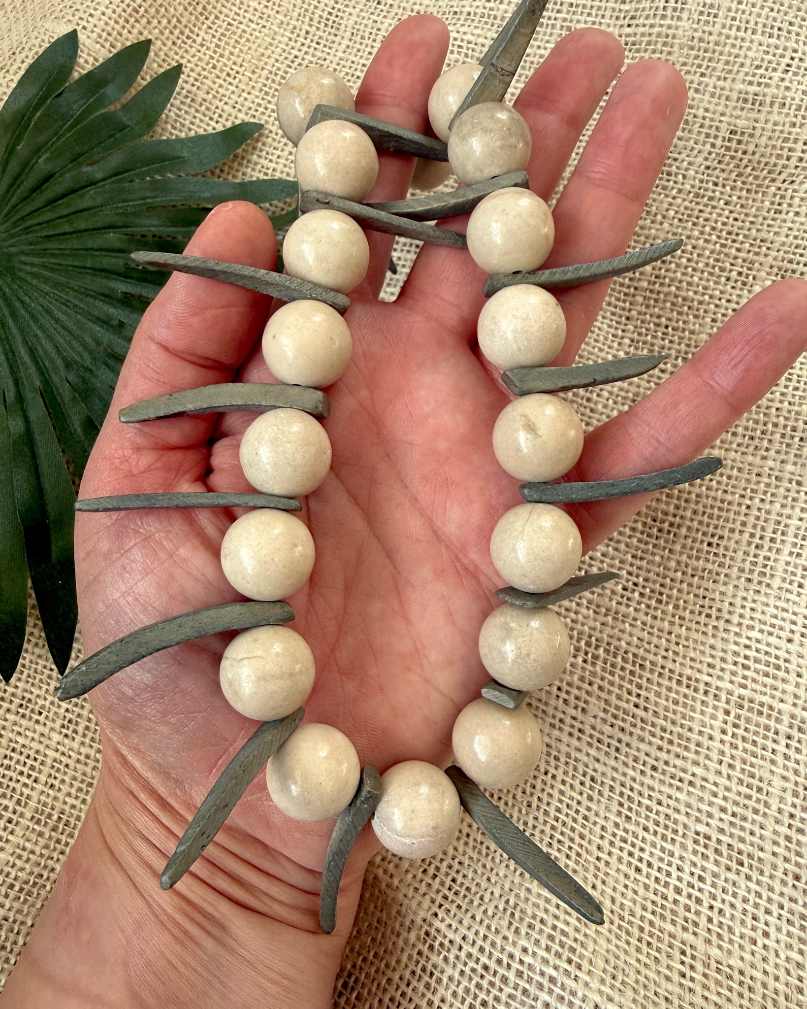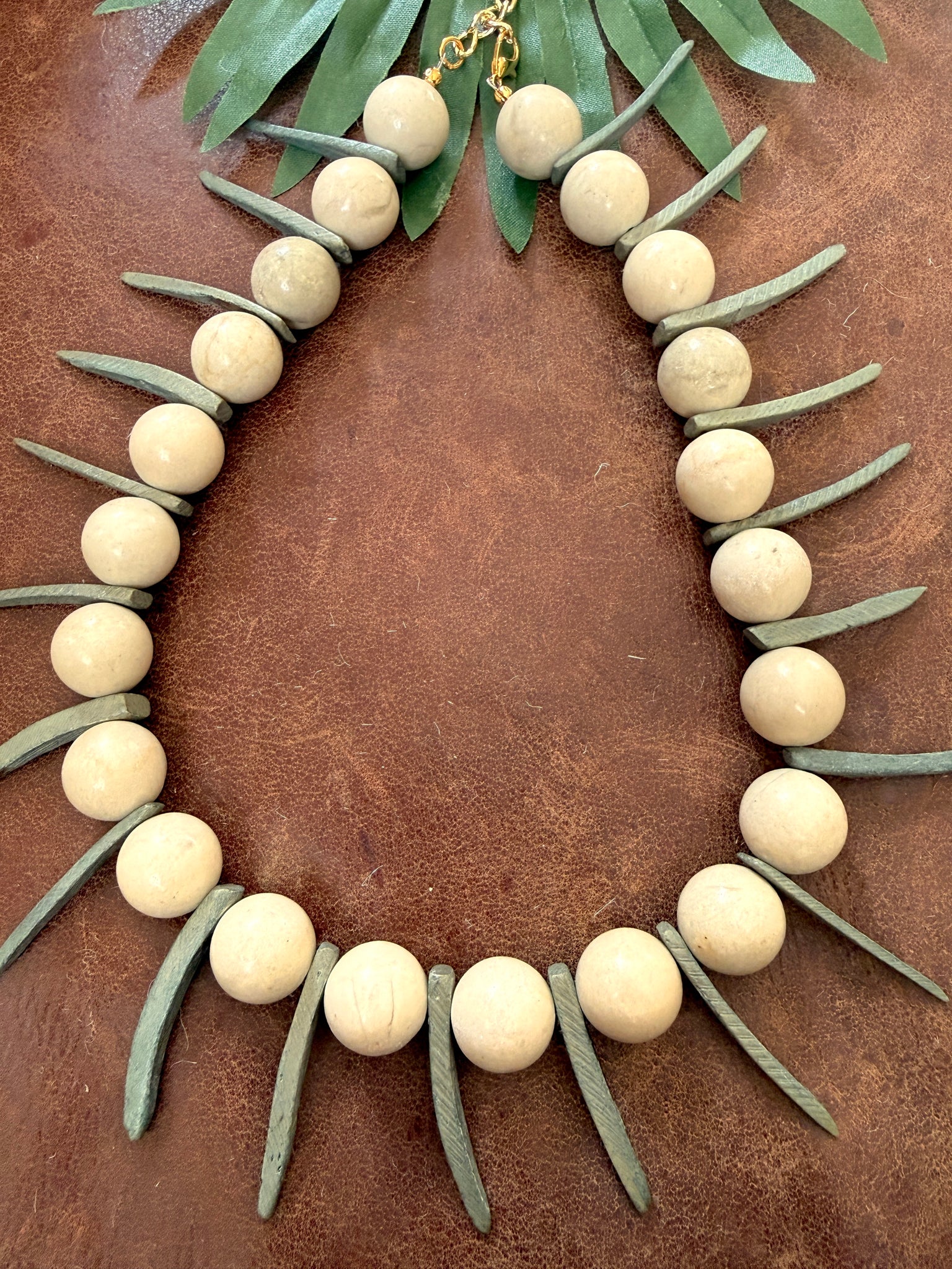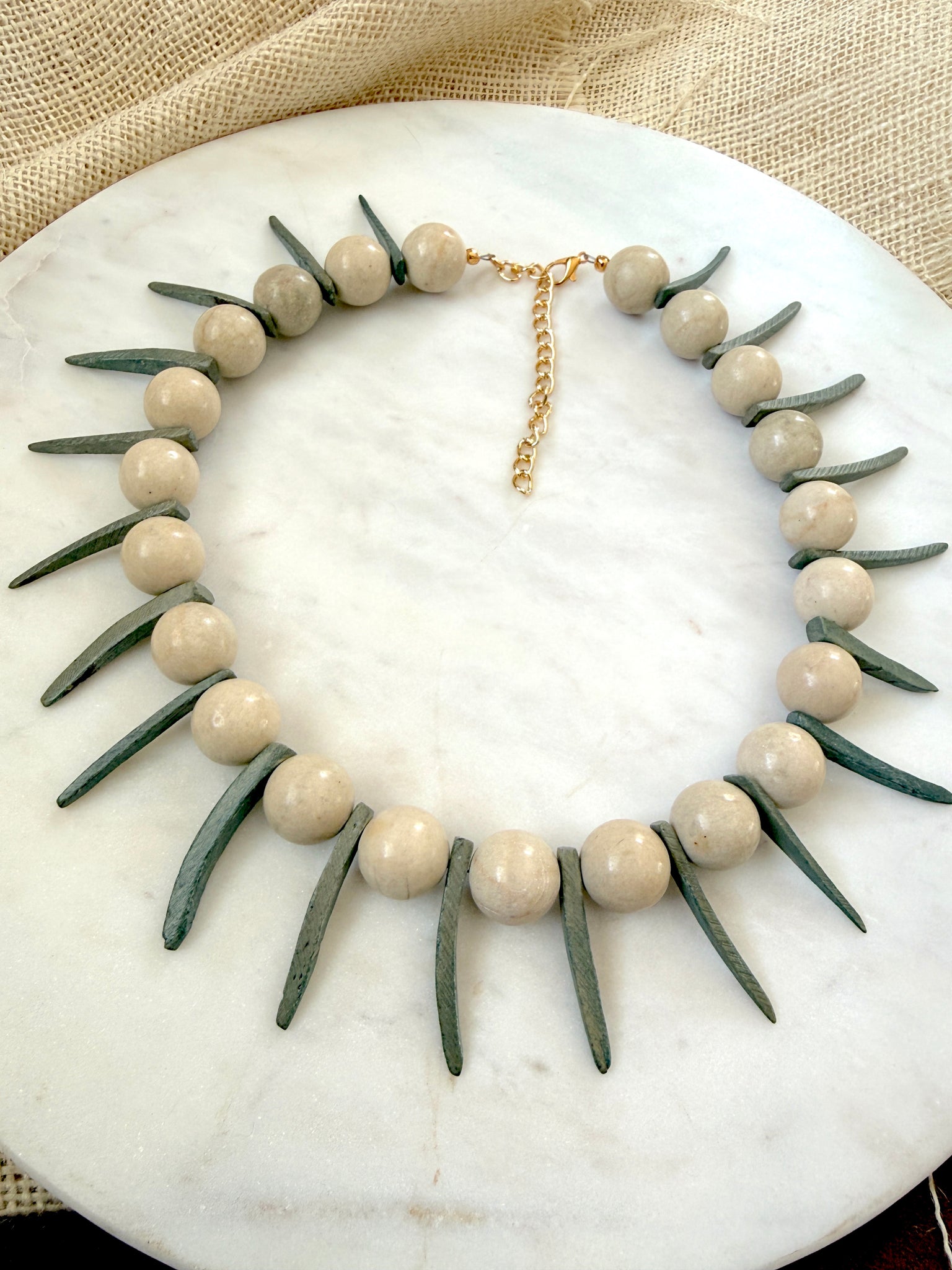 The Vector Point Necklace is a sculptural beaded statement designed around contrast and rhythm. Large 15mm fossil jasper beads alternate with gray-olive coconut dagger spike beads, creating a strong visual line that feels grounded yet sharp.