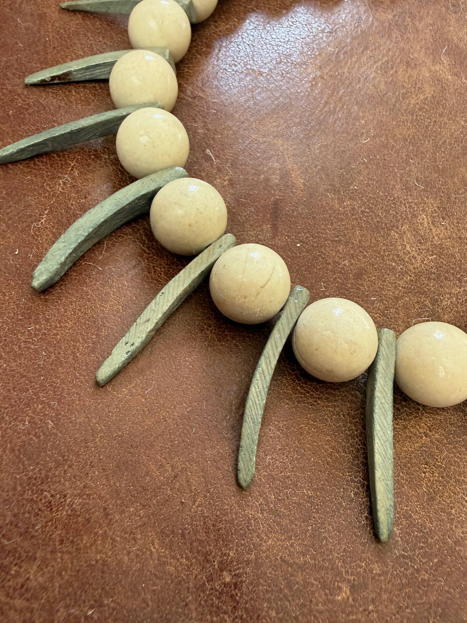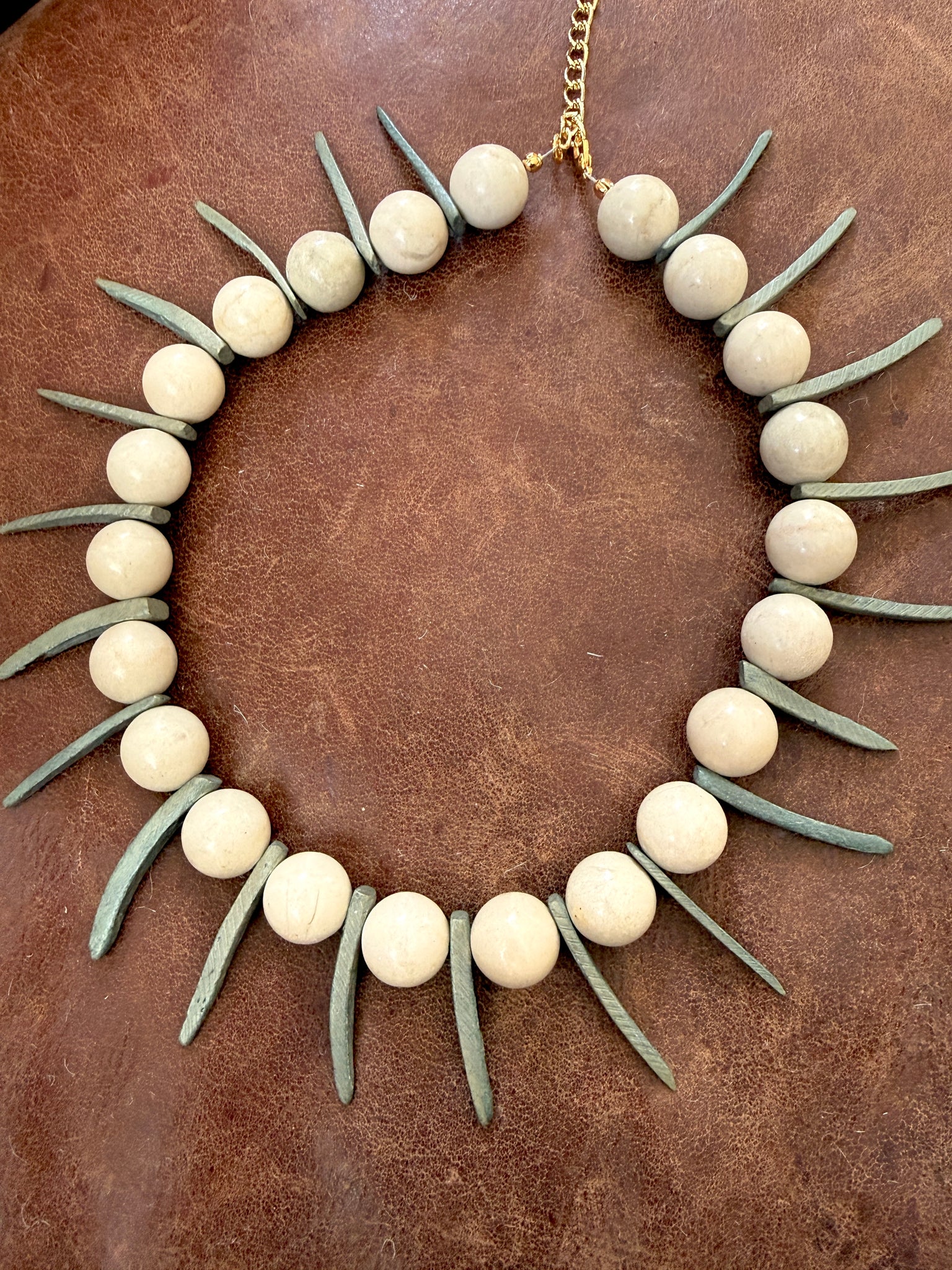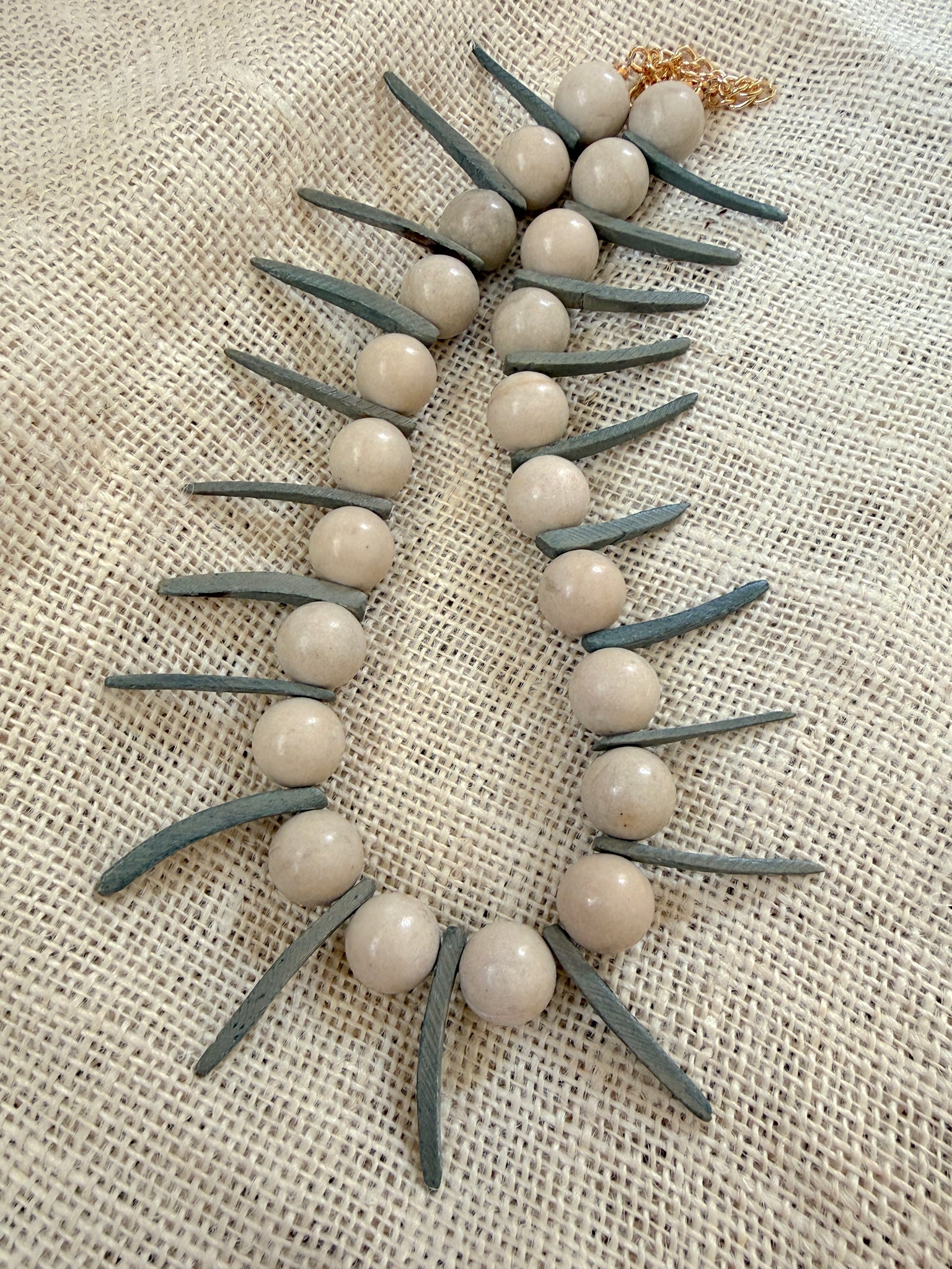The Vector Point Necklace is a sculptural beaded statement designed around contrast and rhythm. Large 15mm fossil jasper beads alternate with gray-olive coconut dagger spike beads, creating a strong visual line that feels grounded yet sharp.