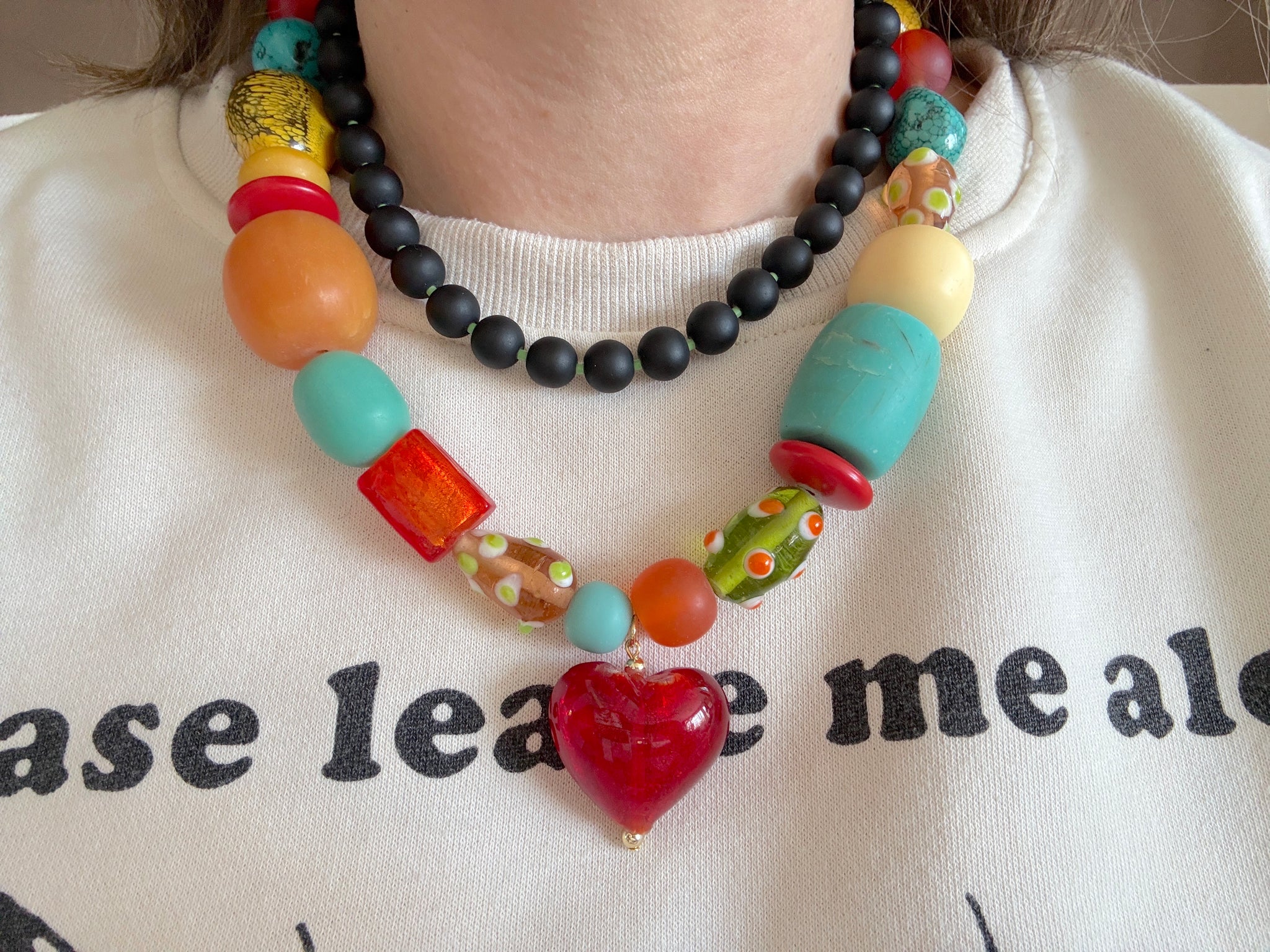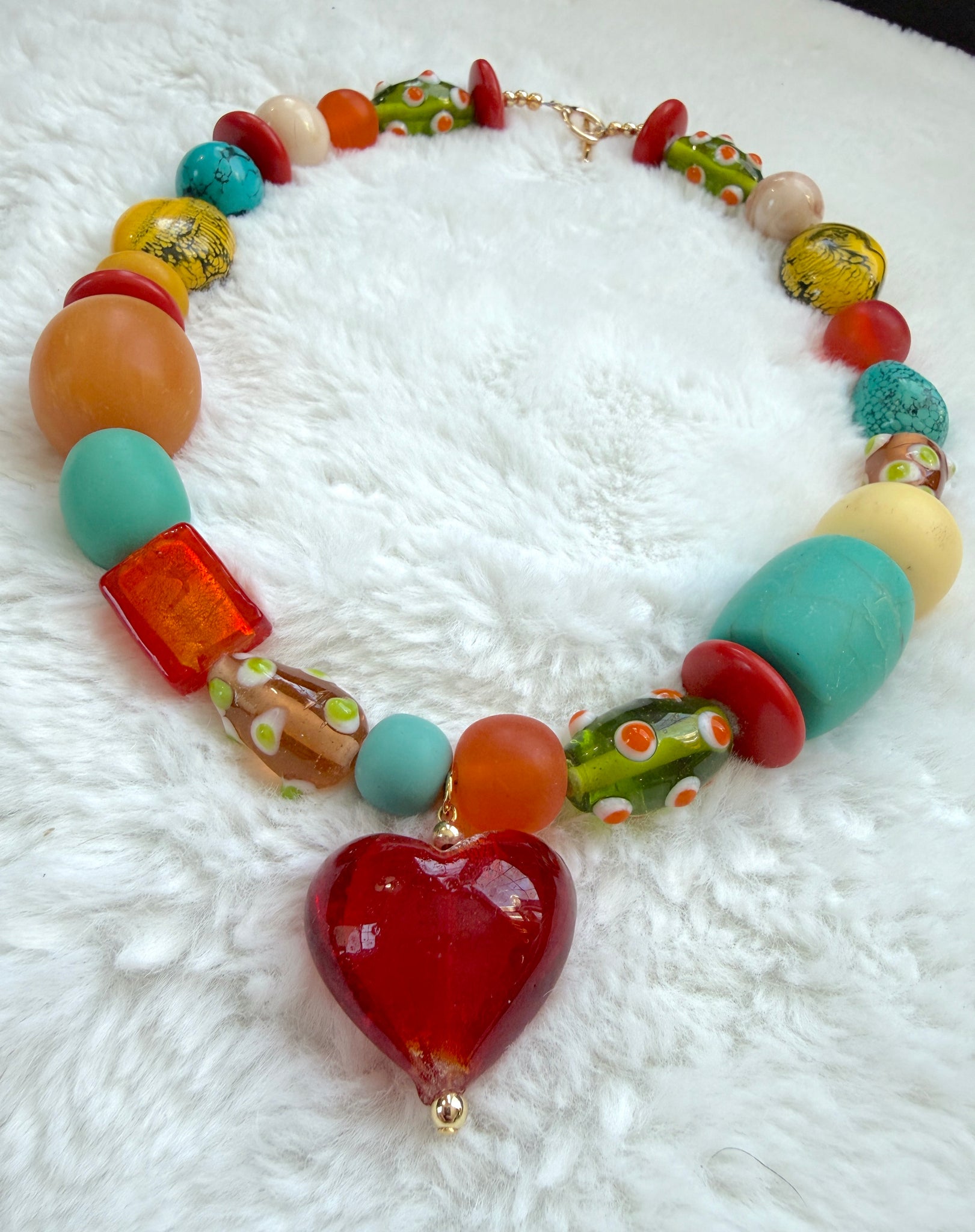 This one-of-a-kind necklace features an eclectic mix of oversized vintage glass and acrylic beads, accented with lampwork beads and finished with a glass heart pendant as the focal point. Saturated hues of red, orange, turquoise, yellow, and green give it that loud-but-artful energy.